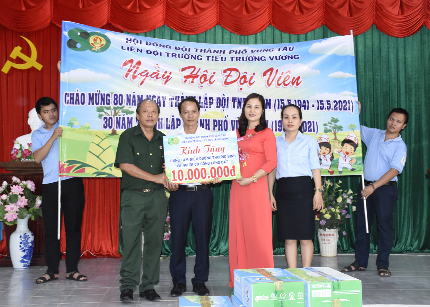 | Đại diện Hội đồng Đội TP. Vũng Tàu và Liên đội Trường TH Trưng Vương trao bảng tượng trưng số tiền 10 triệu đồng cho Trung tâm Điều dưỡng Thương binh và Người có công Long Đất. |