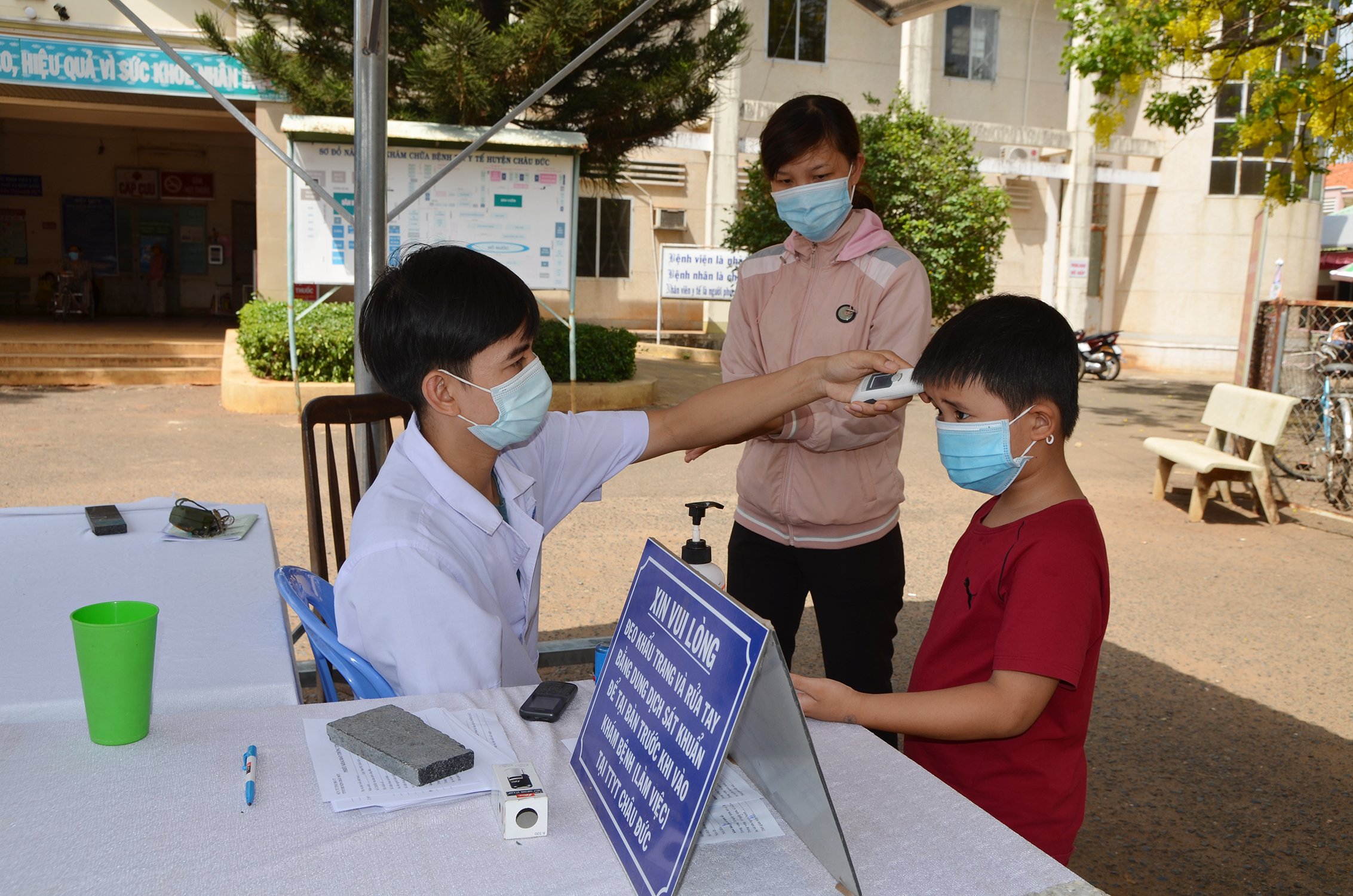 | Nhân viên y tế tại Trung tâm Y tế huyện Châu Đức kiểm tra thân nhiệt những người dân ra, vào trung tâm. Ảnh: DIỄM QUỲNH |