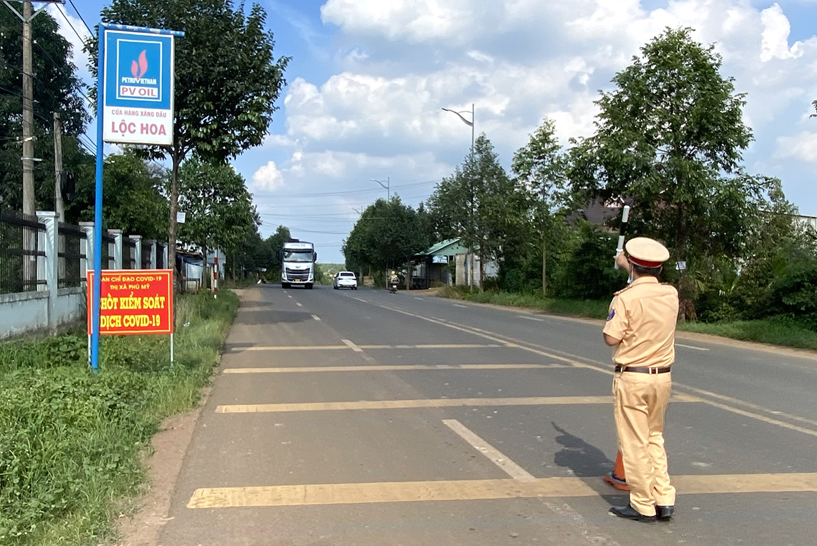 | CSGT TX.Phú Mỹ ra hiệu lệnh dừng phương tiện để kiểm soát tại chốt kiểm soát dịch COVID-19 (ấp Cầu Ri, xã Sông Xoài). |
