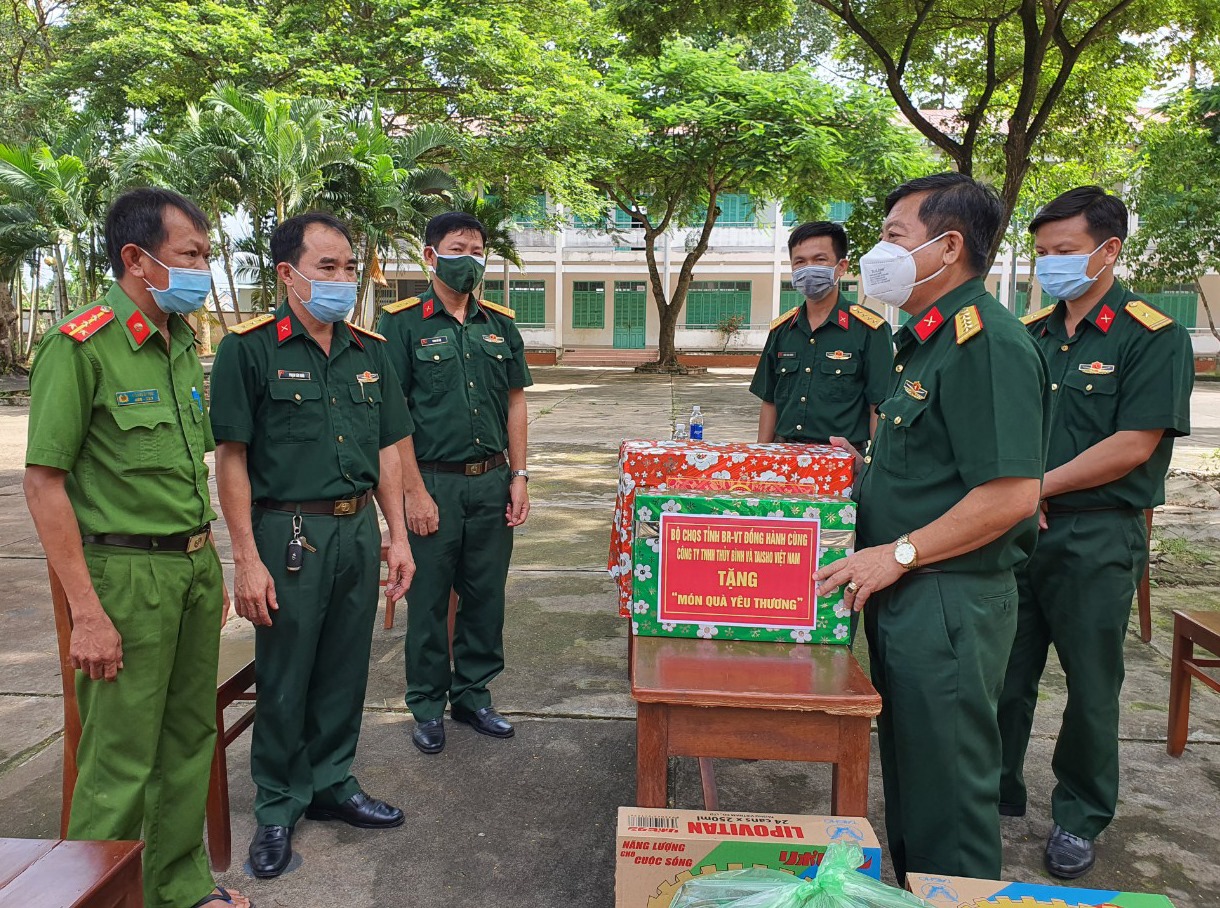 | Đại tá Nguyễn Hoàng Tấn, Phó Chính ủy Bộ CHQS tỉnh (bên phải), tặng quà cho cán bộ, chiến sĩ tại khu cách ly Trường THCS Nguyễn Thị Minh Khai (TT. Ngãi Giao, huyện Châu Đức). |