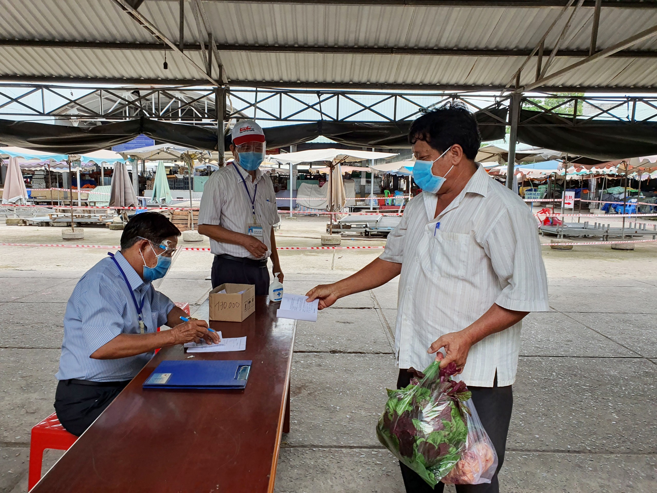 Chợ có 15 gian hàng bán thịt heo, thịt bò, hải sản, rau, củ, quả và nhu yếu phẩm thiết yếu. Ô sạp được sắp xếp giãn cách, hàng cách hàng 4 - 6m; ô cách ô 3 - 5m và chỉ di chuyển theo một chiều. Quầy hàng được bố trí chéo nhau nhằm tránh việc người mua di chuyển trên cùng một lối đi. Tiểu thương đều đeo khẩu trang, kính chắn giọt bắn và giữ khoảng cách tối thiểu 2m với người mua. Tiểu thương Hồ Thị Sang, bán hải sản ở chợ đã hơn 13 năm nay. Bà Sang cũng như các tiểu thương khác khi vào chợ đều khai báo y tế và thực hiện nghiêm quy định phòng, chống dịch. Vừa bán hàng, thi thoảng bà lại nhắc khách đứng giãn cách để giữ an toàn. Bà Sang cho biết: “Hải sản được tập kết trước cổng chợ. BQL chợ phun khử khuẩn bên ngoài bao bì, sau đó tôi mới đưa vào sạp bán. Hàng hóa phải có xuất xứ rõ ràng và được kiểm soát chặt chẽ. Mô hình hoạt động mới của chợ giúp cả người bán lẫn người mua đều yên tâm”.