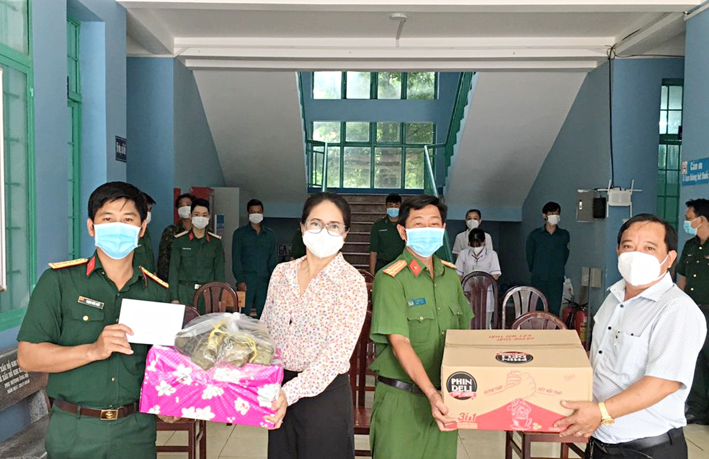 | Bà Lê Thị Trang Đài, Chủ tịch UBND huyện Xuyên Mộc, Trưởng Ban Chỉ đạo Phòng, chống dịch COVID-19 huyện tặng quà cho lực lượng làm nhiệm vụ khu cách ly tập trung Trường THCS Bưng Riềng. |