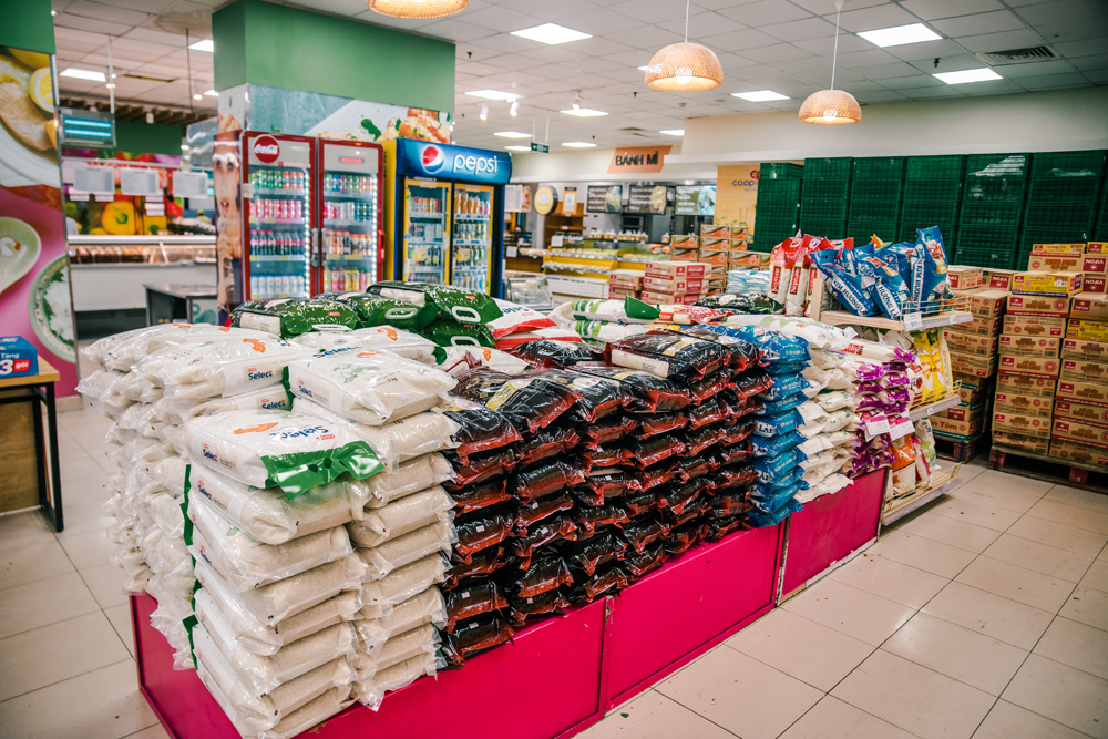 | Các mặt hàng rau, củ, quả tươi và lương thực đầy ắp trên quầy, kệ siêu thị Co.op Mart Vũng Tàu. |