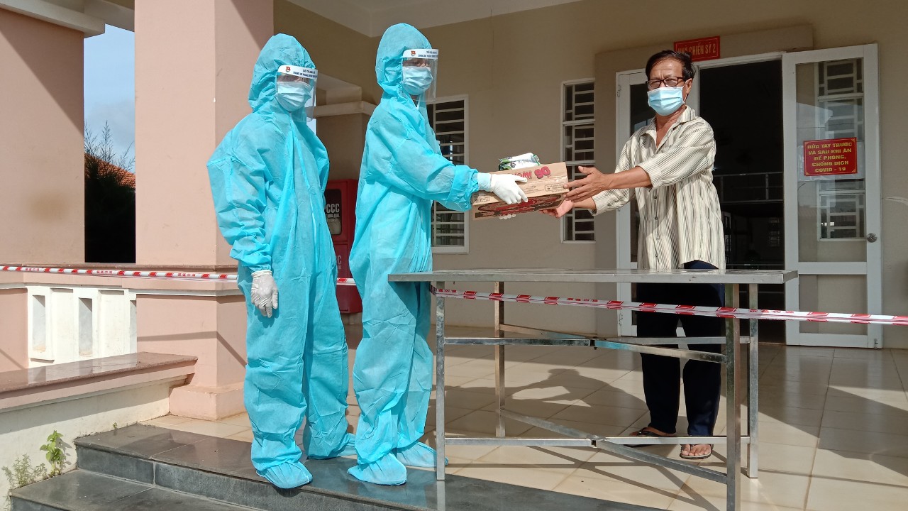 | Lực lượng làm nhiệm vụ trao nhu yếu phẩm cho người cách ly ở khu cách ly tập trung tại Ban CHQS xã Bình Trung, huyện Châu Đức. Ảnh: Trúc Giang |