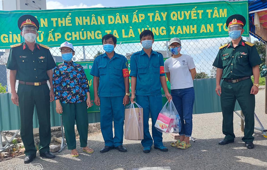 | Đại diện Ban Chỉ huy Trung đoàn Minh Đạm tặng quà cho lực lượng đang làm nhiệm vụ phòng, chống dịch COVID-19 tại chốt tự quản ấp Tây (xã Hòa Long, TP. Bà Rịa). |