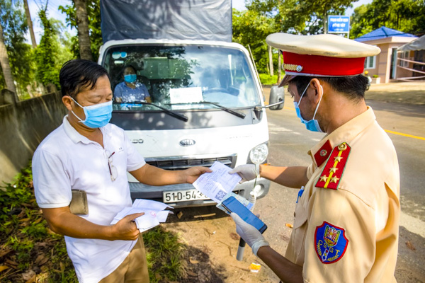 | Lực lượng CSGT kiểm tra giấy tờ của tài xế khi lưu thông qua chốt kiểm tra y tế trên QL55. |