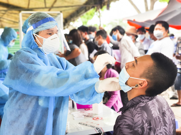 | Một tài xế xe tải được lấy mẫu test nhanh COVID-19 tại chốt kiểm tra y tế trên Quốc lộ 51, TX. Phú Mỹ. |