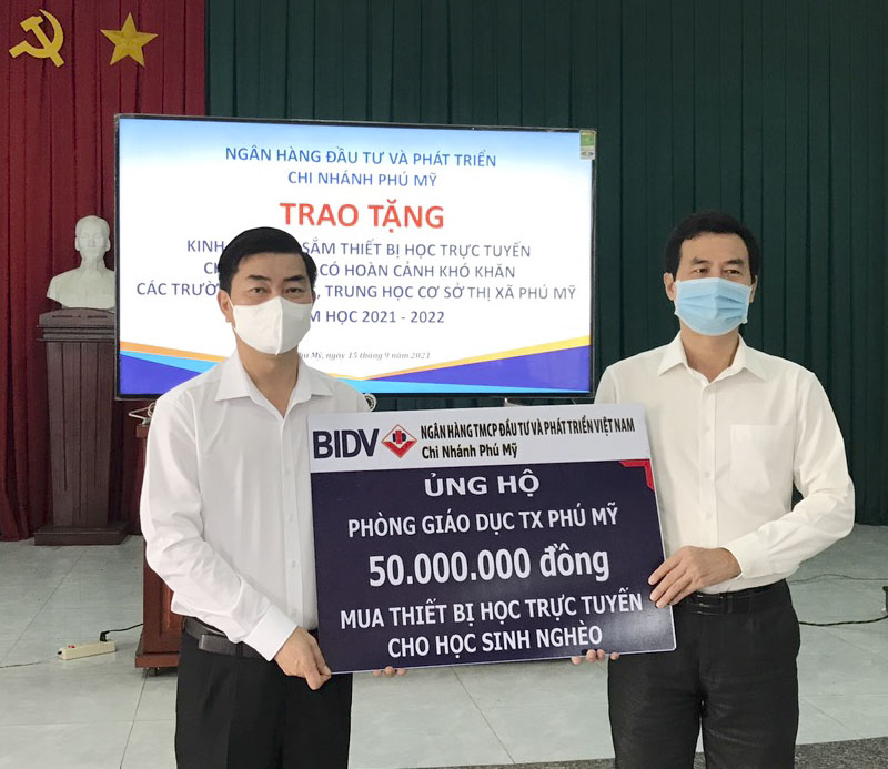 Ngày 15/9, Ngân hàng Đầu tư và Phát triển Việt Nam (BIDV) - Chi nhánh Phú Mỹ đã ủng hộ Phòng GD-ĐT TX. Phú Mỹ 50 triệu đồng để mua thiết bị học trực tuyến cho HS có hoàn cảnh khó khăn trên địa bàn. Số tiền này được trích từ Quỹ an sinh xã hội của đơn vị.