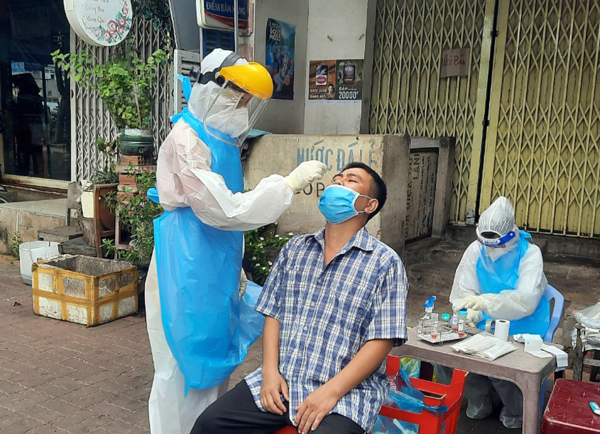 | Nhân viên y tế lấy mẫu cho người dân sống trong khu nhà trọ tại khu phố Hải Sơn, TT. Long Hải) sáng 26/10. |