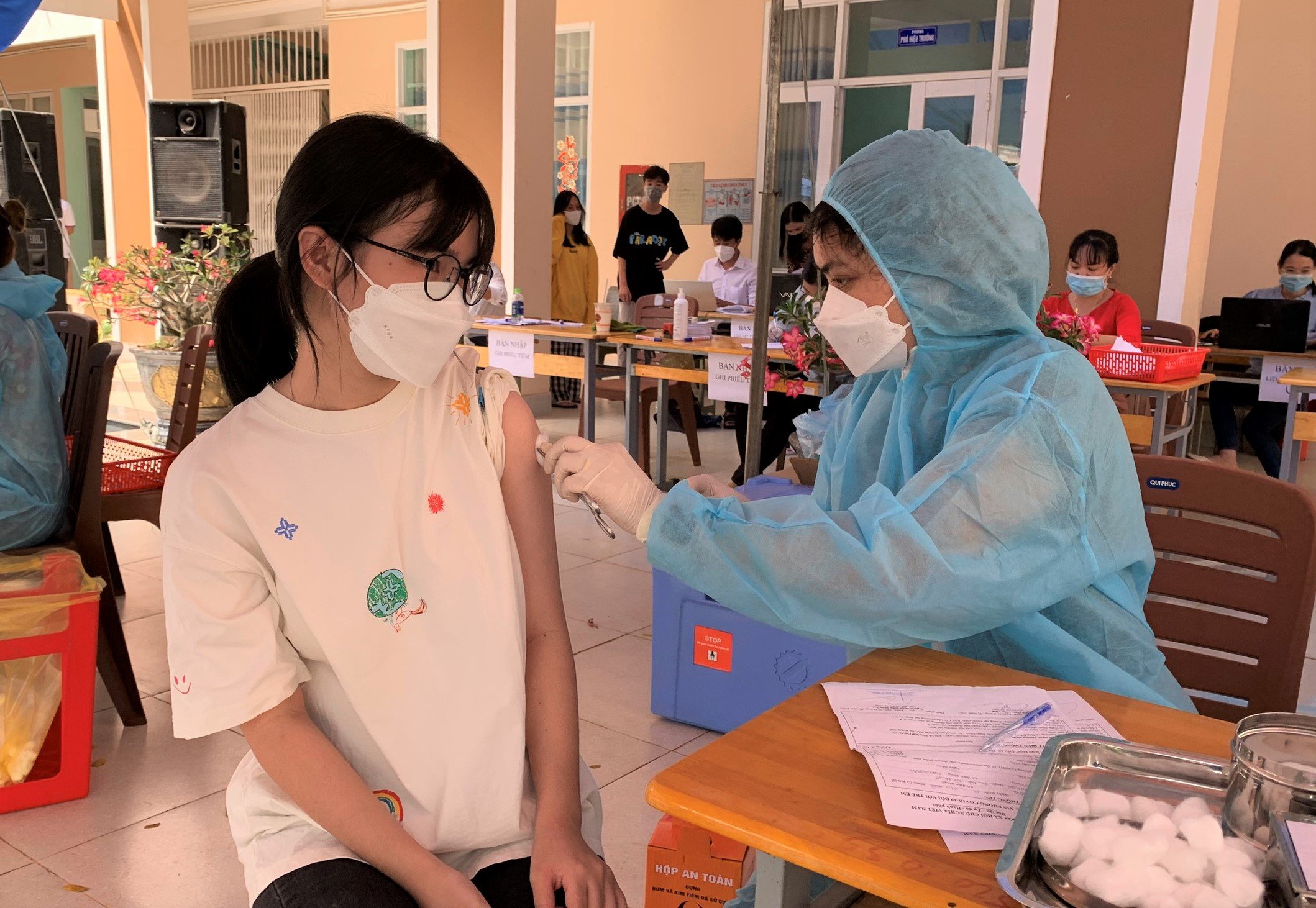 | Nhân viên y tế tiêm vắc-xin cho trẻ em từ 15 đến 17 tuổi tại điểm tiêm Trường THCS Châu Đức. |