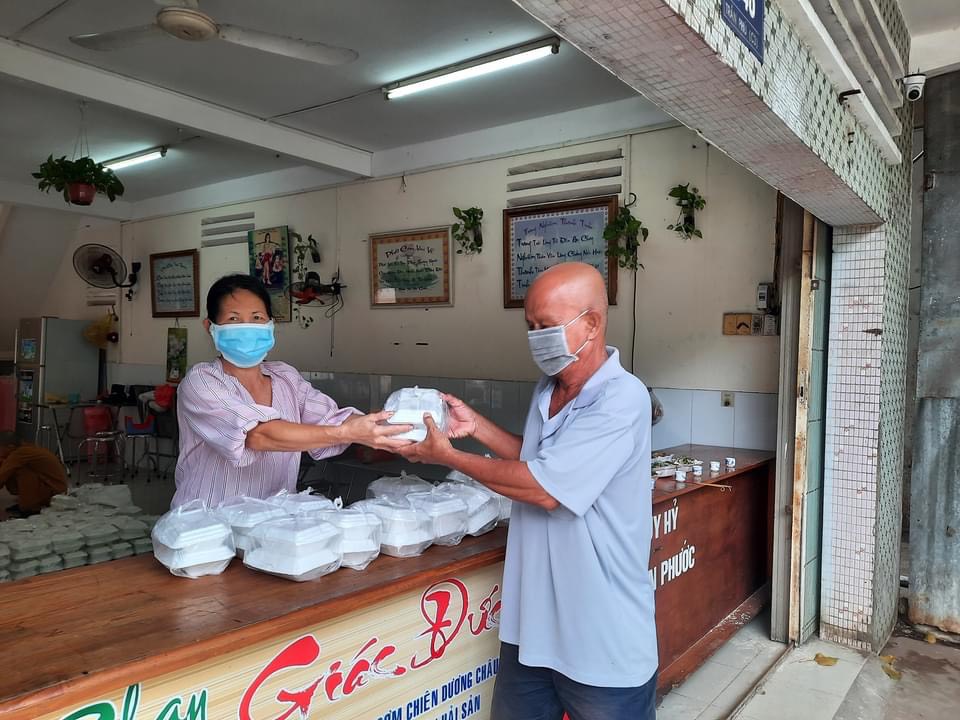 | Người dân khó khăn nhận cơm tại bếp ăn tình thương của Tịnh Xá Ngọc Đức. |