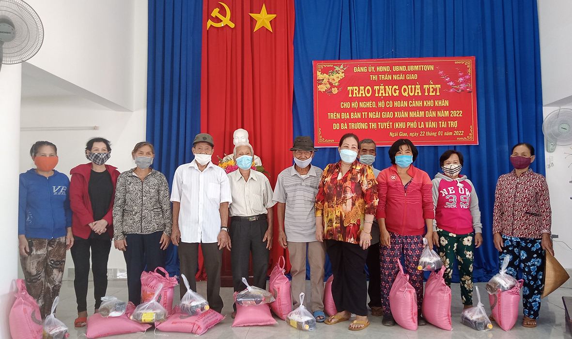 Chiều 22/1, Đảng ủy, HĐND, UBND, Ủy ban MTTQ Việt Nam TT. Ngãi Giao (huyện Châu Đức) tổ chức tặng 200 phần quà Tết cho các hộ nghèo, có hoàn cảnh khó khăn tại địa phương. Mỗi phần quà trị giá 250 ngàn đồng, gồm: 10 kg gạo, dầu ăn, nước mắm, bột ngọt. Kinh phí tặng quà là 50 triệu đồng do bà Trương Thị Tuyết (tiểu thương tại chợ Ngãi Giao) hỗ trợ.