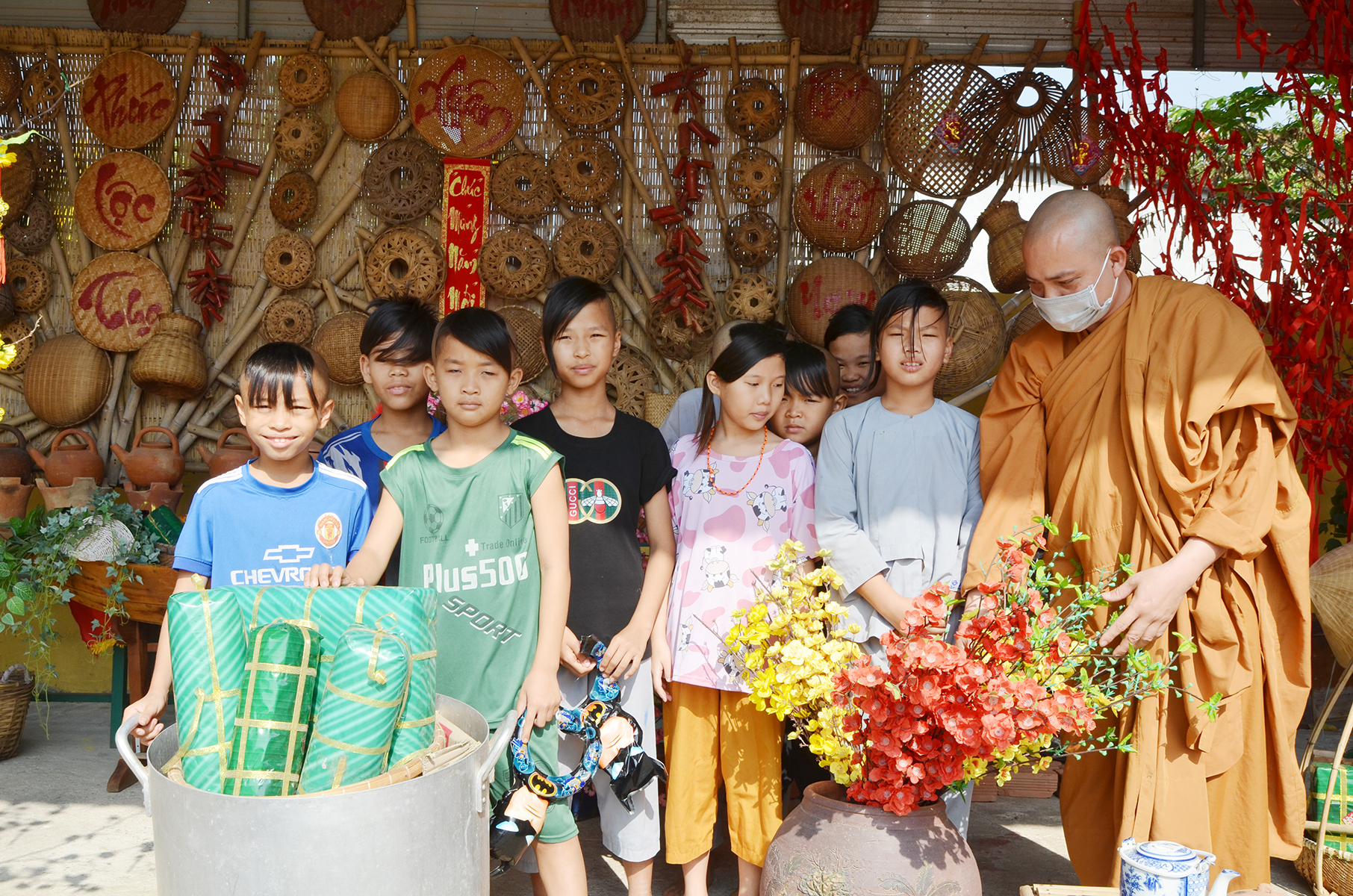 Đến Trung tâm nhân đạo Hồng Quang (chùa Hồng Quang, xã Tân Hòa, TX. Phú Mỹ) - nơi đang nuôi dưỡng 69 trẻ mồ côi, cơ nhỡ những ngày này, không khí Tết đã ngập tràn. Trung tâm đã trang trí, sắp đặt nhiều tiểu cảnh đậm chất Tết của thôn quê: mẹt tre, rổ tre, tràng pháo đỏ, cành mai vàng, nồi bánh chưng, bánh tét, niêu cơm đất, bếp dầu...