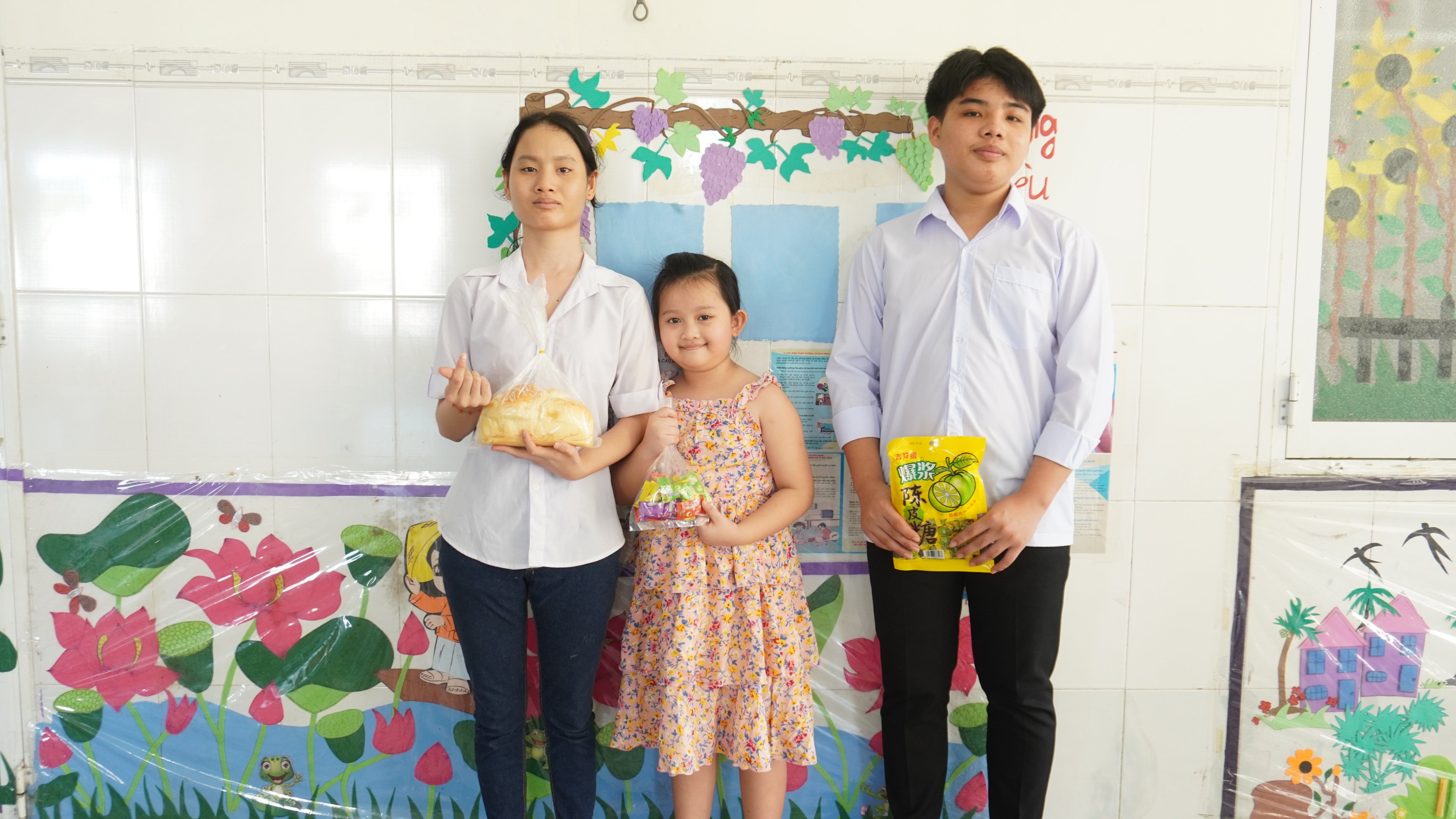 | Trẻ em được nuôi dưỡng tại Mái ấm Thi Ân khoe những phần quà Tết vừa được tặng. |