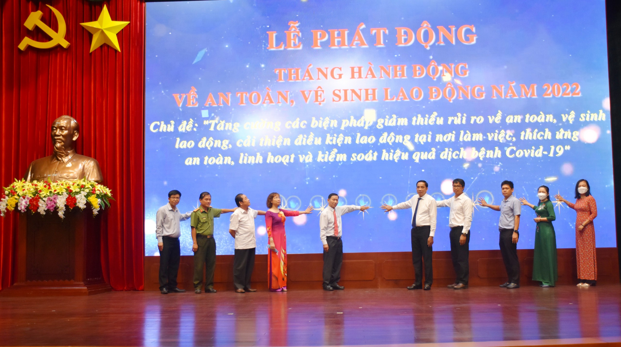 | Thành viên Hội đồng ATVSLĐ tỉnh thực hiện nghi thức phát động Tháng hành động về ATVSLĐ năm 2022. |