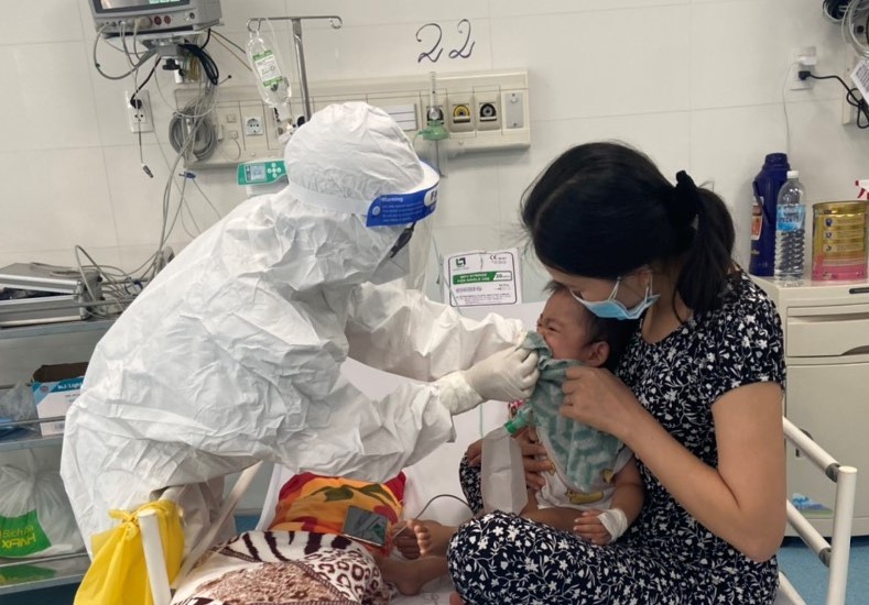 | Bác sĩ thăm khám cho trẻ nhiễm COVID-19 điều trị tại Bệnh viện Vũng Tàu. Ảnh: HOÀNG HƯỜNG |