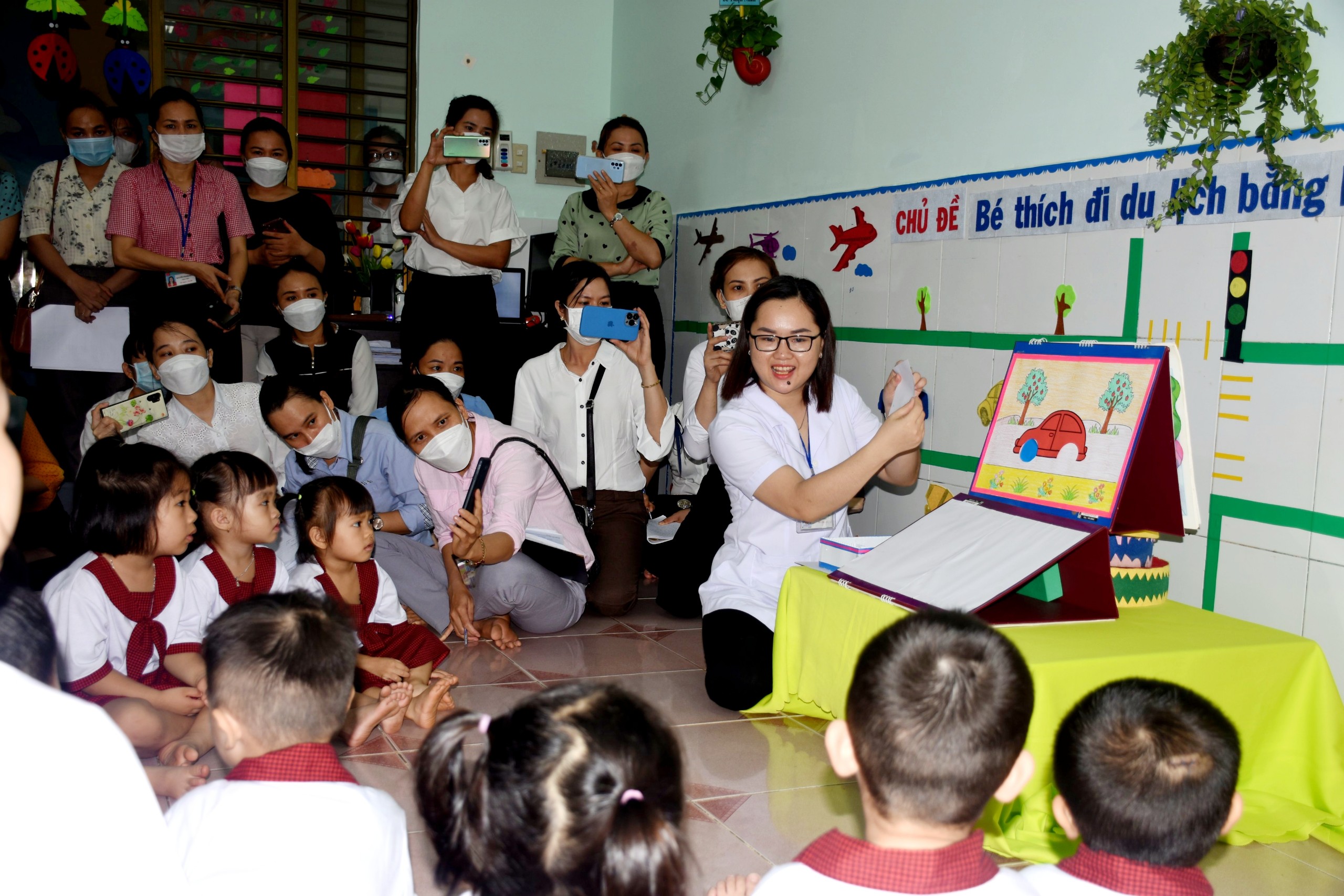 Tại Trường MN Ánh Dương, đơn vị được chọn làm trường điểm trong thực hiện chuyên đề, các GV đã được tham quan khuôn viên trường, các phòng học, khu vực trưng bày đồ chơi sáng tạo từ vật liệu tái chế, tham dự các tiết dạy của GV nhà trường…