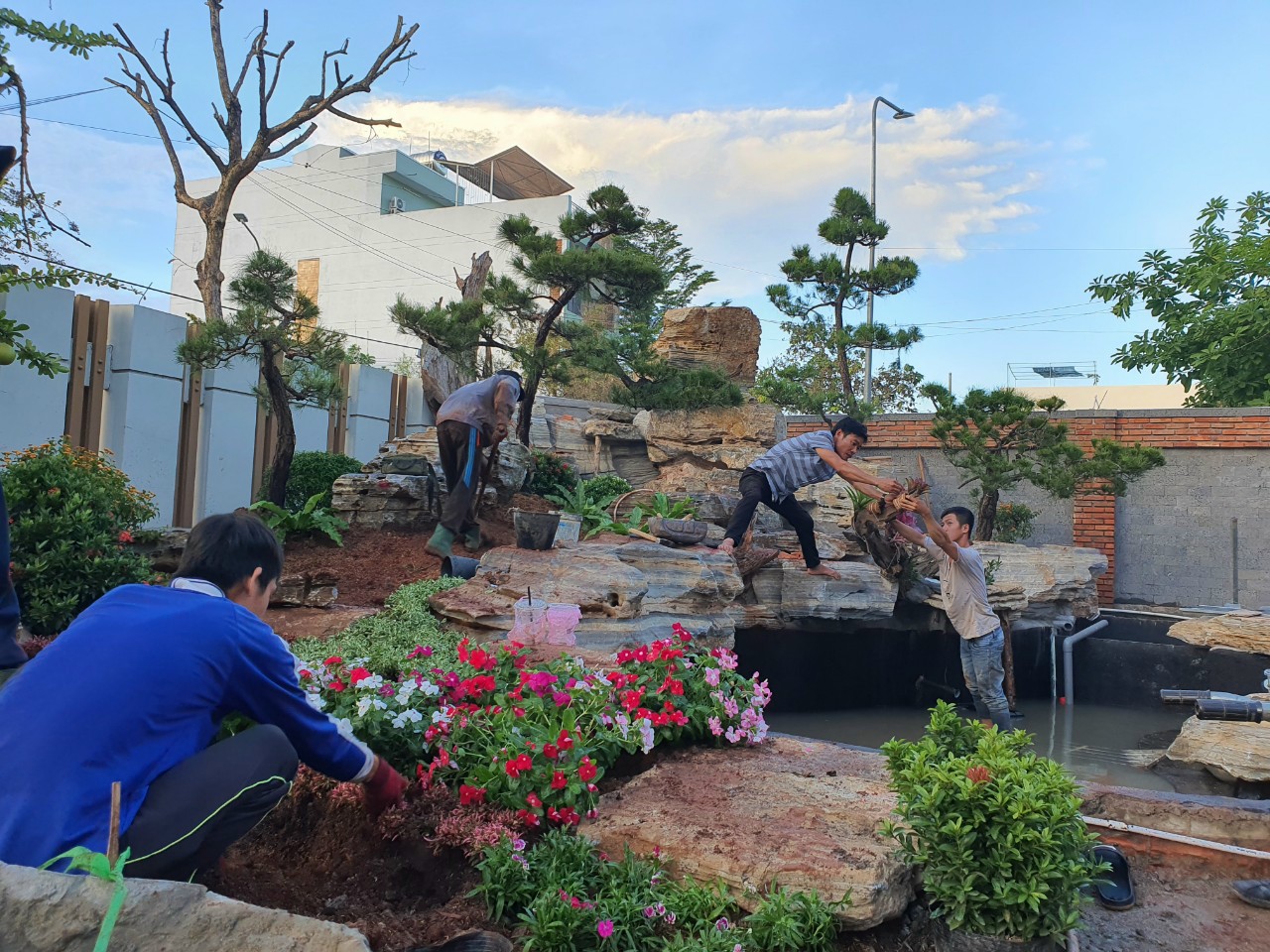 Thông thường mỗi công trình là tổ hợp gồm hồ cá, hòn non bộ, thác nước, cây xanh, sân cỏ…, trong đó nhiều công trình khá kỳ công. Đơn cử việc tìm kiếm các tảng đá lớn để bố trí làm hồ cá và trang trí cho bắt mắt cũng là việc rất tốn thời gian, công sức, đá chủ yếu phải vận chuyển từ các tỉnh Thanh Hóa, Nghệ An và ở khu vực Tây Nguyên.