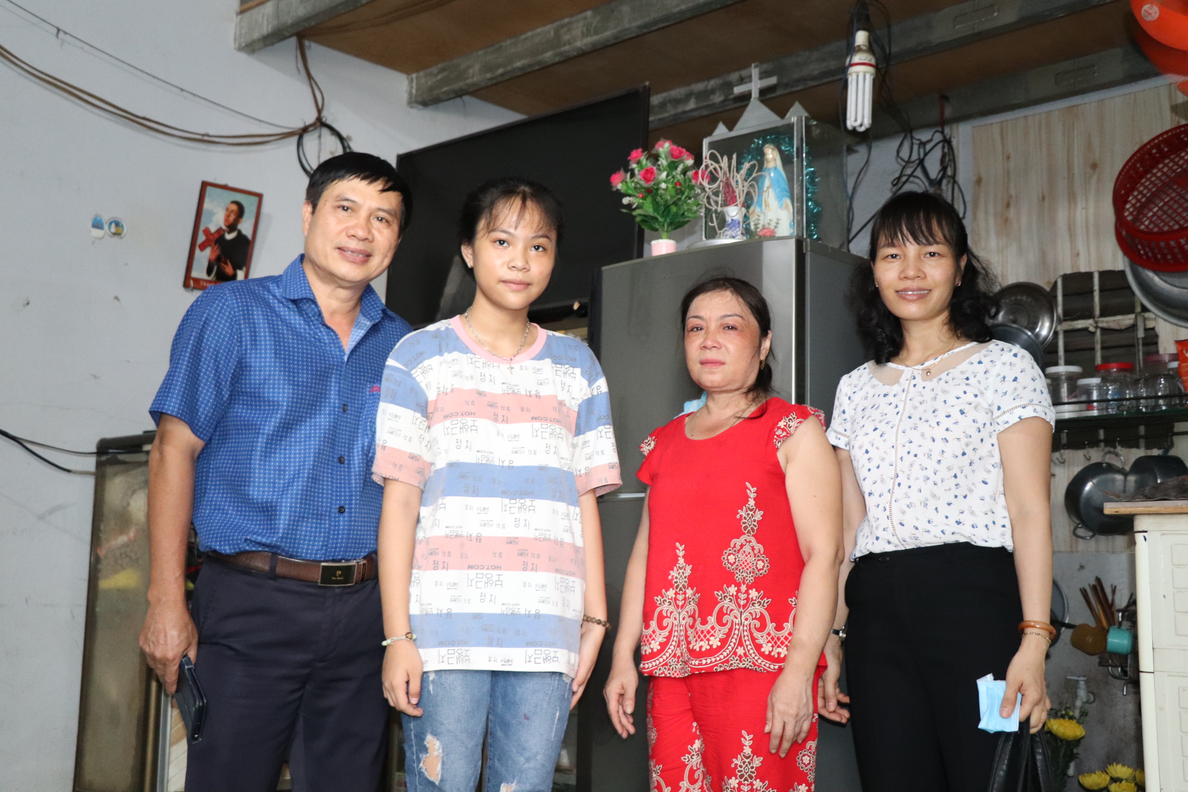 | Thầy Phương và cô Nhài (bìa phải) đến nhà, động viên em Vũ Như Quỳnh đi học. |