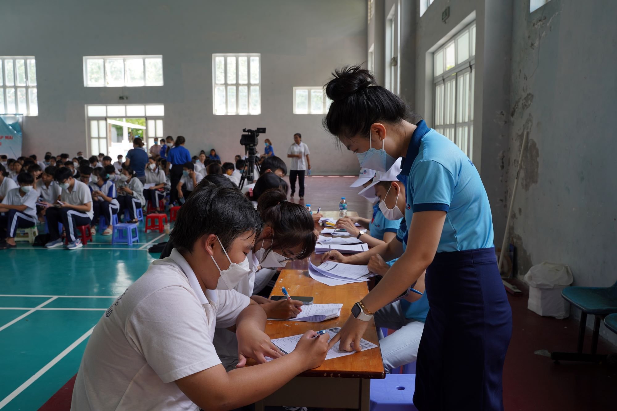| Nhân viên Ngân hàng Vietinbank hỗ trợ đoàn viên thanh niên cài đặt ứng dụng thanh toán không dùng tiền mặt |