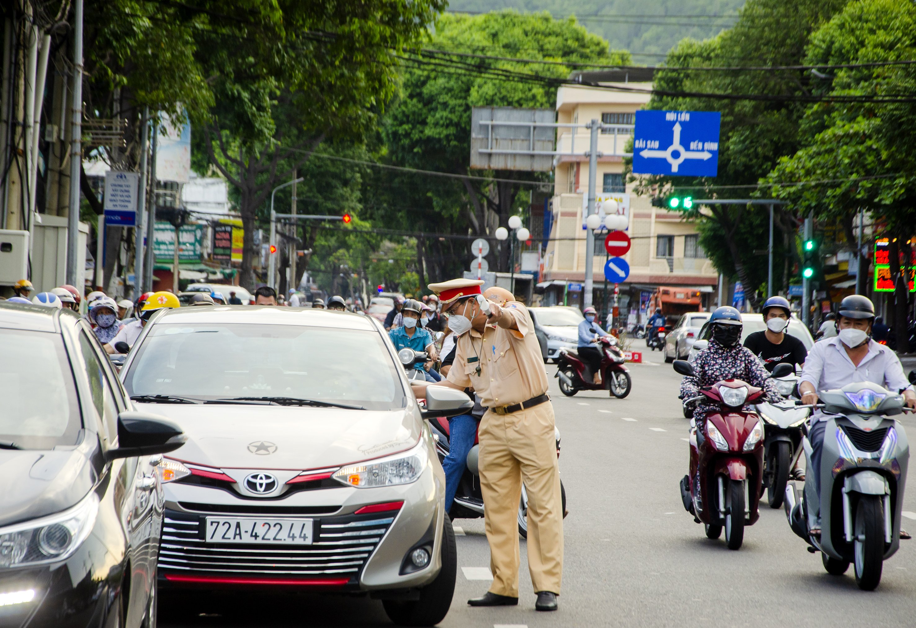 | Lực lượng Cảnh sát giao thông hướng dẫn phụ huynh thực hiện việc phân luồng giao thông, tránh kẹt xe tại cổng trường. |