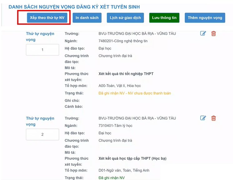 Bước 8: Trong phần DANH SÁCH NGUYỆN VỌNG ĐĂNG KÝ XÉT TUYỂN SINH, thí sinh chọn mục XẾP THEO THỨ TỰ NV để điều chỉnh thứ tự các nguyện vọng bằng các phương thức tuyển sinh riêng của các trường ĐH và đã có kết quả xét tuyển.