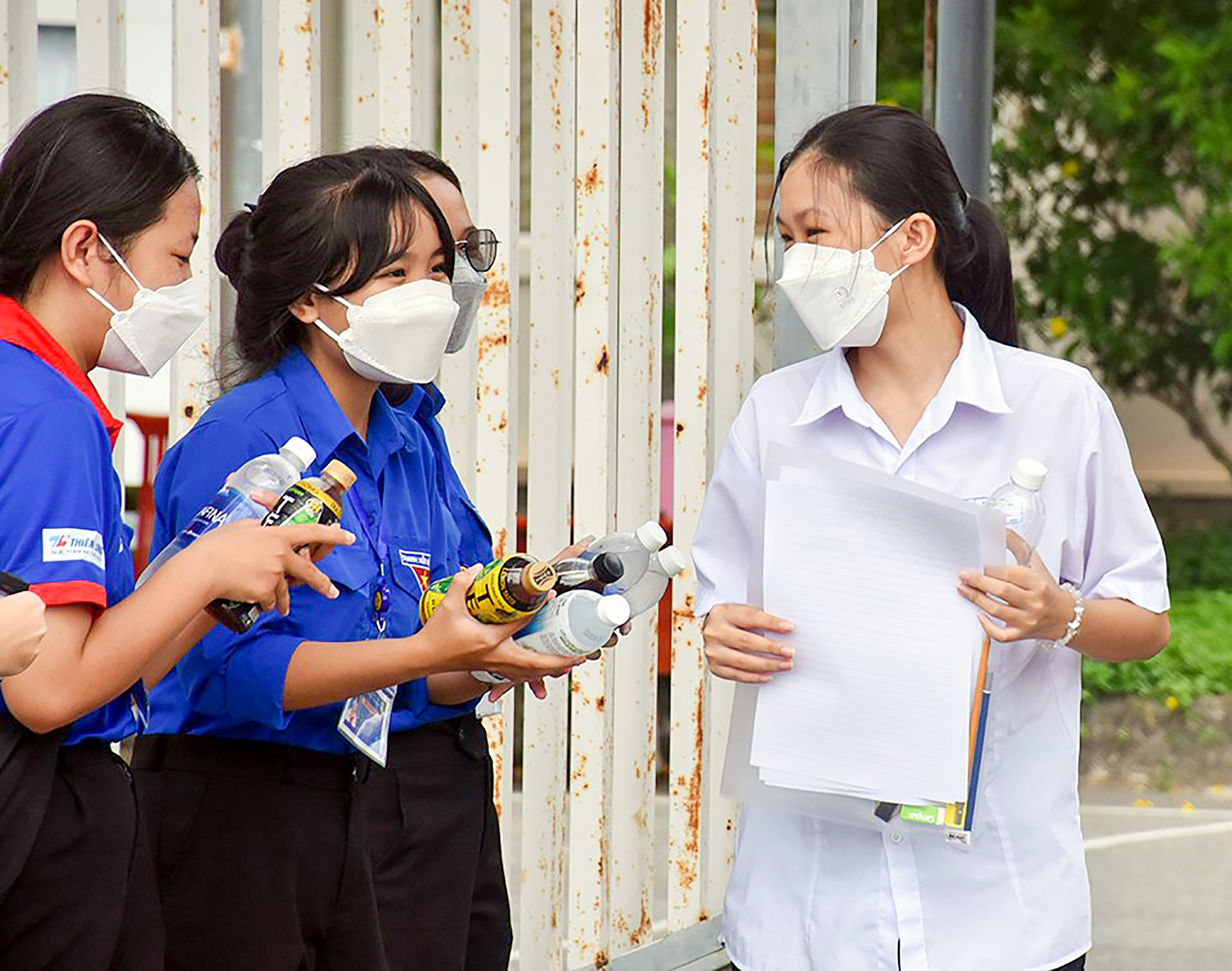| Đội TNTN hỗ trợ TS tại điểm thi Trường THPT MInh Đạm (huyện Long Điền). Ảnh: VINH MINH |