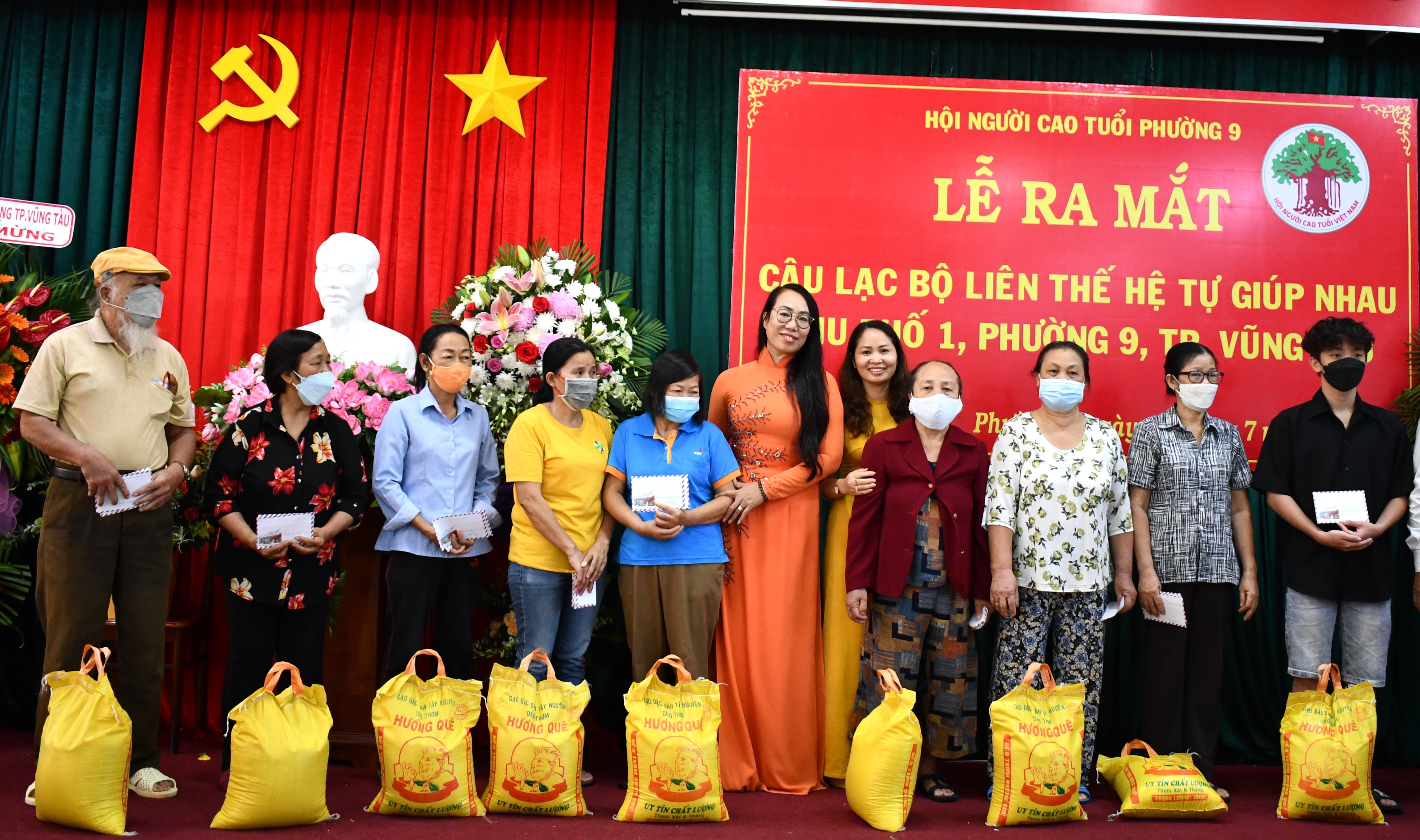 | Đại diện Hội Người cao tuổi tỉnh tặng quà cho CLB Liên thế hệ tự giúp nhau khu phố 1, phường 9, TP. Vũng Tàu. |