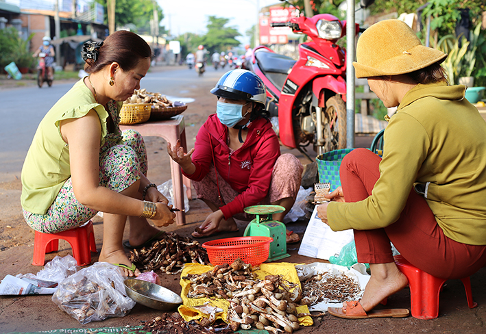 Sau một đêm săn tìm nấm mối, người dân mang ra các điểm thu mua nằm dọc tuyến đường liên xã để bán cho thương lái. Những lúc nấm mối “cháy” hàng, thương lái vào chốt chặn trong rừng, rẫy để thu mua cả đêm. Bà Đoàn Thị Xuân (46 tuổi, ngụ xã Bàu Lâm, huyện Xuyên Mộc) cho biết, buổi đêm hai vợ chồng vào lô cao su mua nấm mối. Đến sáng, chồng bà tiếp tục đóng chốt trong lô để mua, còn bà ra ngoài đường liên xã vừa mua nấm vừa đóng gói gửi đi cho khách. Nhiều năm làm nghề buôn bán nấm mối, bà Xuân đã gây dựng cho mình được nhiều đầu mối mua bán nấm. Mỗi lần người dân kiếm được nấm đều gọi điện báo cho bà tới mua. Bà còn đóng gói gửi nấm cho bạn hàng ở các chợ trong tỉnh và những tỉnh lân cận.