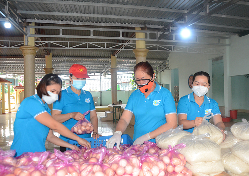 | Chị Bùi Thị Thu Diễm, Chủ tịch Hội LHPN phường 12, TP. Vũng Tàu (bìa phải) chuẩn bị các phần quà tặng người dân gặp khó khăn do dịch COVID-19 vào cuối năm 2021. |