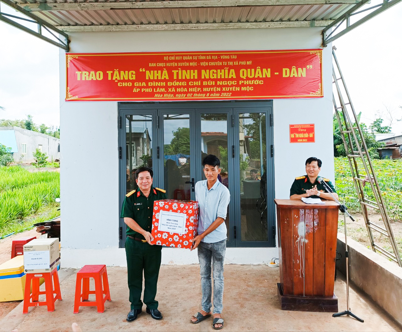 Sáng 2/8, Bộ Chỉ huy Quân sự tỉnh Bà Rịa-Vũng Tàu phối hợp với Viện Chuyên tu TX. Phú Mỹ; Ban Chỉ huy Quân sự huyện Xuyên Mộc và xã Hòa Hiệp (huyện Xuyên Mộc) tổ chức lễ trao tặng “Nhà tình nghĩa Quân - Dân” cho gia đình anh Bùi Ngọc Phước, hiện là Sĩ quan dự bị, thường trú ấp Phú Lâm, xã Hòa Hiệp có hoàn cảnh khó khăn về nhà ở.