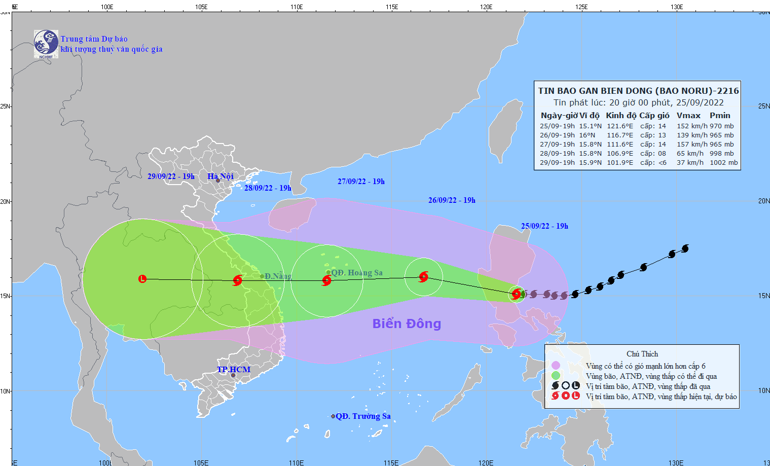 Dự báo trong 24 giờ tới, bão di chuyển chủ yếu theo hướng Tây Tây Bắc, mỗi giờ đi được 20-25km, đi vào Biển Đông. Đến 19 giờ ngày 26/9, vị trí tâm bão ở khoảng 16,0 độ Vĩ Bắc; 116,7 độ Kinh Đông, cách quần đảo Hoàng Sa khoảng 460 km về phía Đông. Sức gió mạnh nhất vùng gần tâm bão mạnh cấp 13 (134-149km/giờ), giật cấp 16.