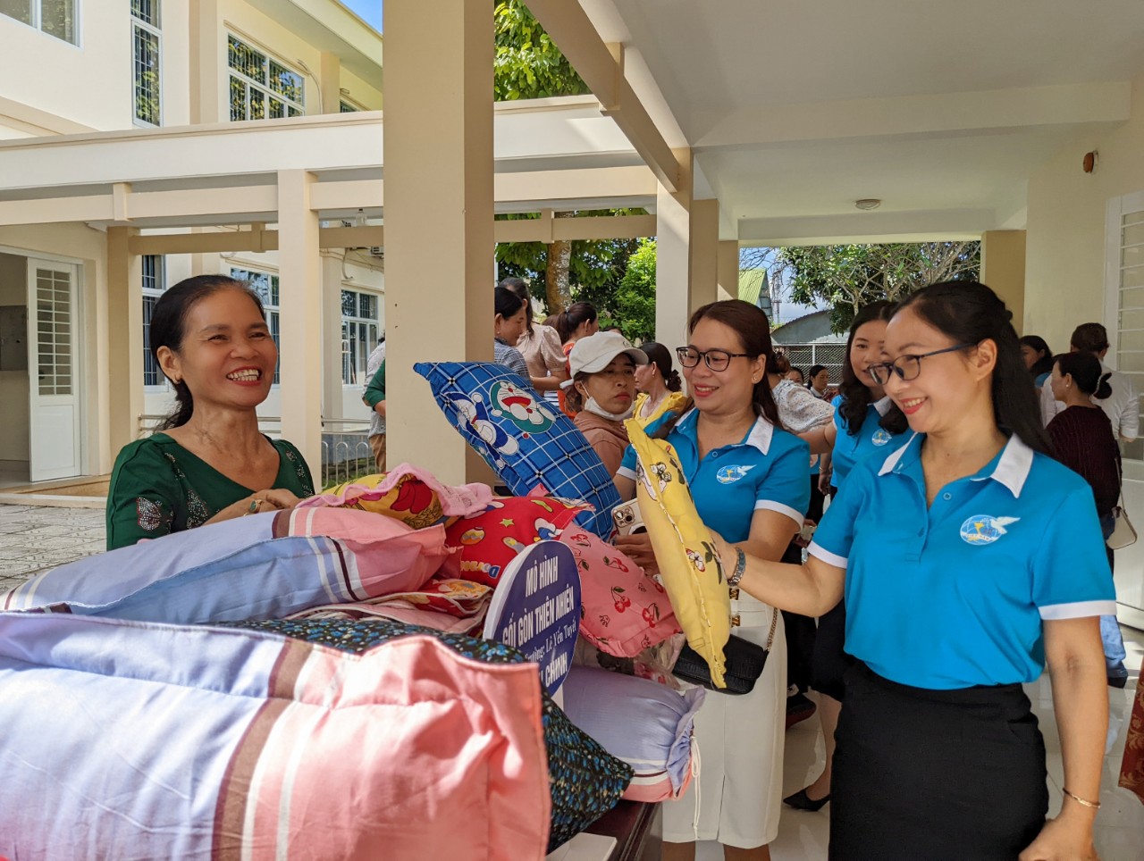 | Cán bộ Hội LHPN huyện Châu Đức tham quan gian hàng gối làm từ bông gòn của hội viên. |