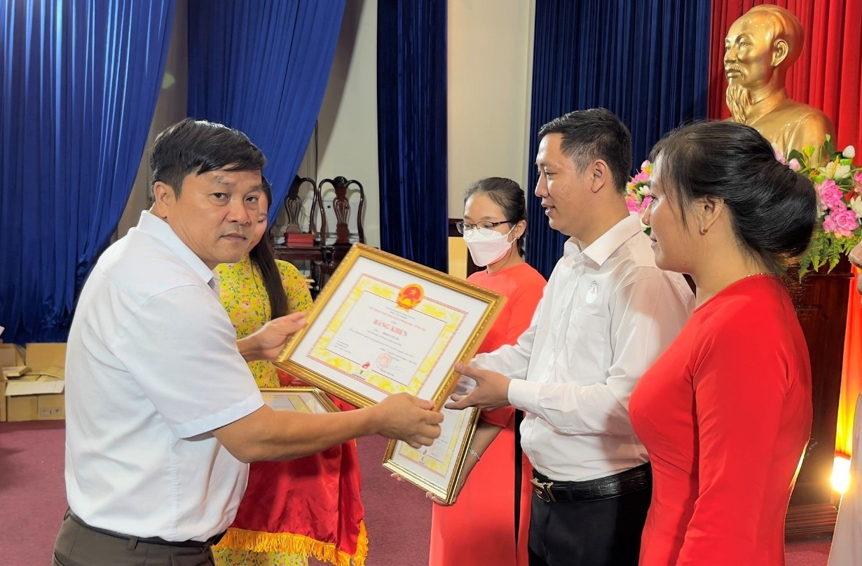 | Ông Phạm Văn Quyền, Phó Chủ tịch UBND huyện Châu Đức trao Bằng khen của UBND tỉnh cho các tập thể, cá nhân có thành tích xuất sắc trong công tác hiến máu tình nguyện năm 2021. |