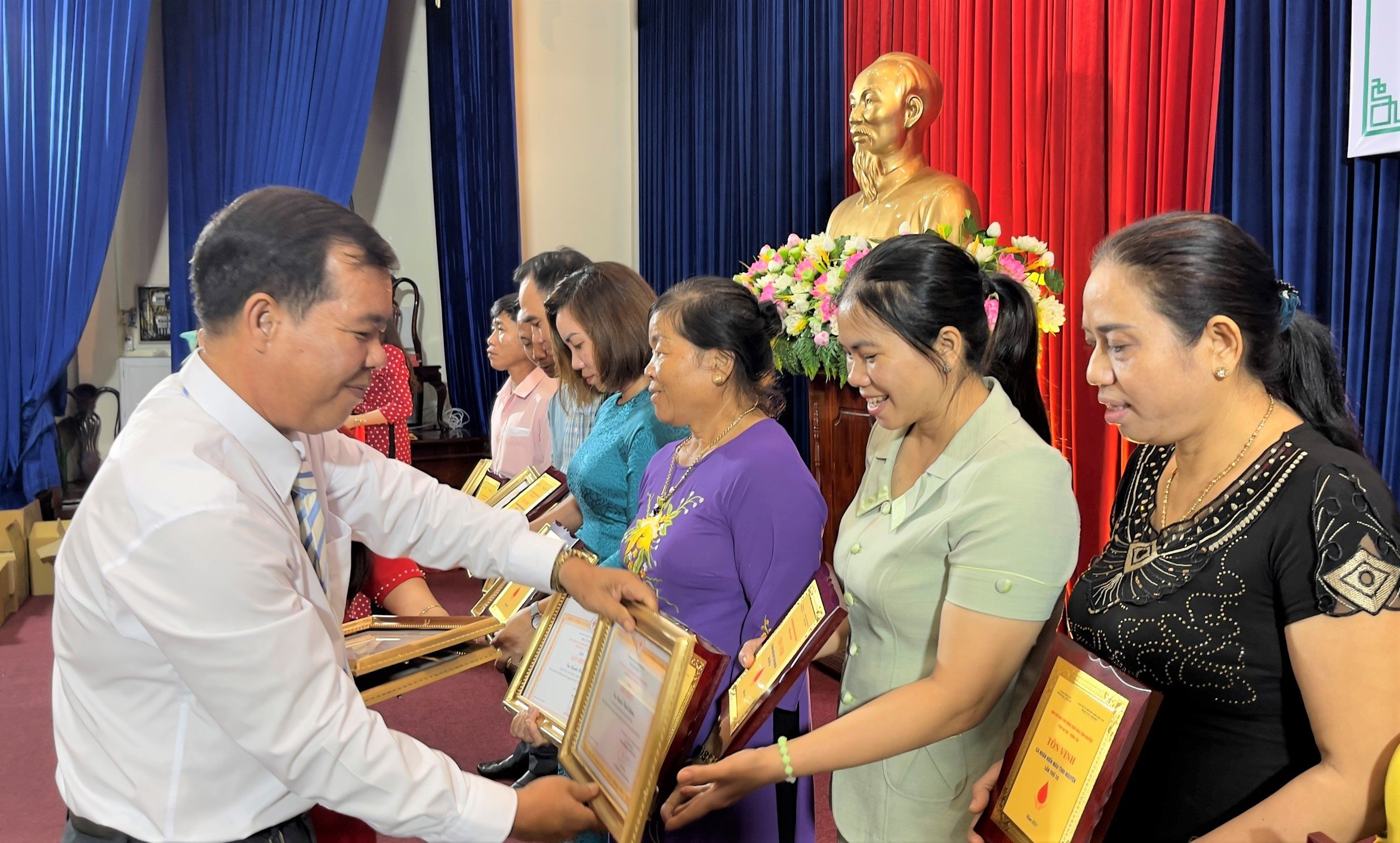 | Ông Lê Văn Hậu, Chủ tịch Hội Chữ thập đỏ tỉnh khen thưởng các tập thể, cá nhân có thành tích xuất sắc trong công tác hiến máu tình nguyện. |