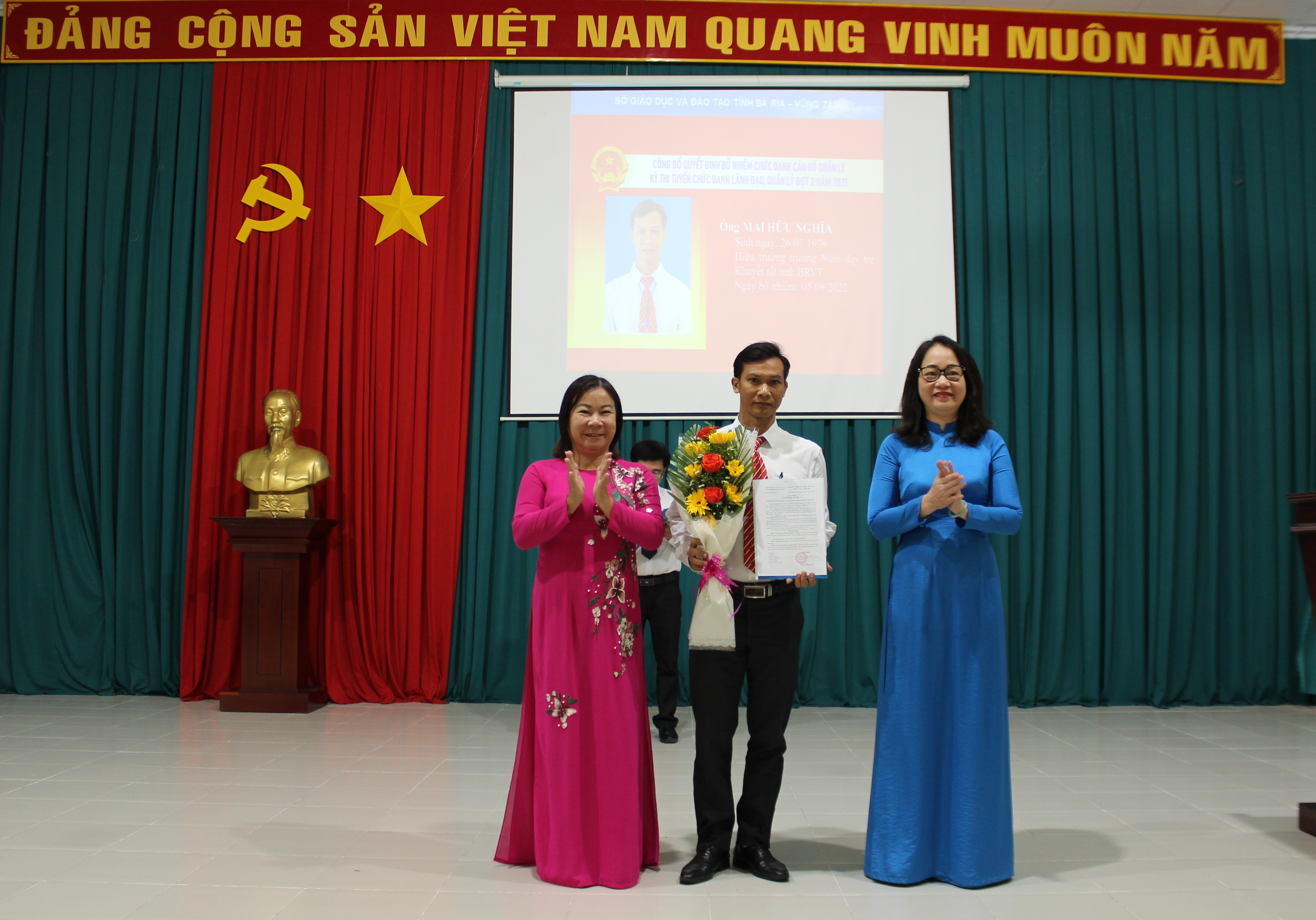 Tại buổi lễ, có 4 cá nhân được bổ nhiệm chức danh cấp Trưởng, gồm: ông Đoàn Vũ Công Hoài, Phó Hiệu trưởng Trường THPT Nguyễn Khuyến (TP. Vũng Tàu) giữ chức vụ Hiệu trưởng Trường THPT Nguyễn Du (huyện Châu Đức); ông Mai Hữu Nghĩa, Phó Hiệu trưởng Trường Nuôi dạy trẻ khuyết tật Bà Rịa giữ chức vụ Hiệu trưởng Trường Nuôi dạy trẻ khuyết tật Bà Rịa; ông Nguyễn Thành Nhân, Phó Hiệu trưởng Trường THPT Trần Văn Quan (huyện Long Điền) giữ chức vụ Hiệu trưởng Trường THPT Võ Thị Sáu (huyện Đất Đỏ); ông Nguyễn Tùng Giang, Phó Giám đốc Trung tâm GDTX Phú Mỹ giữ chức vụ Giám đốc Trung tâm GDTX Phú Mỹ.