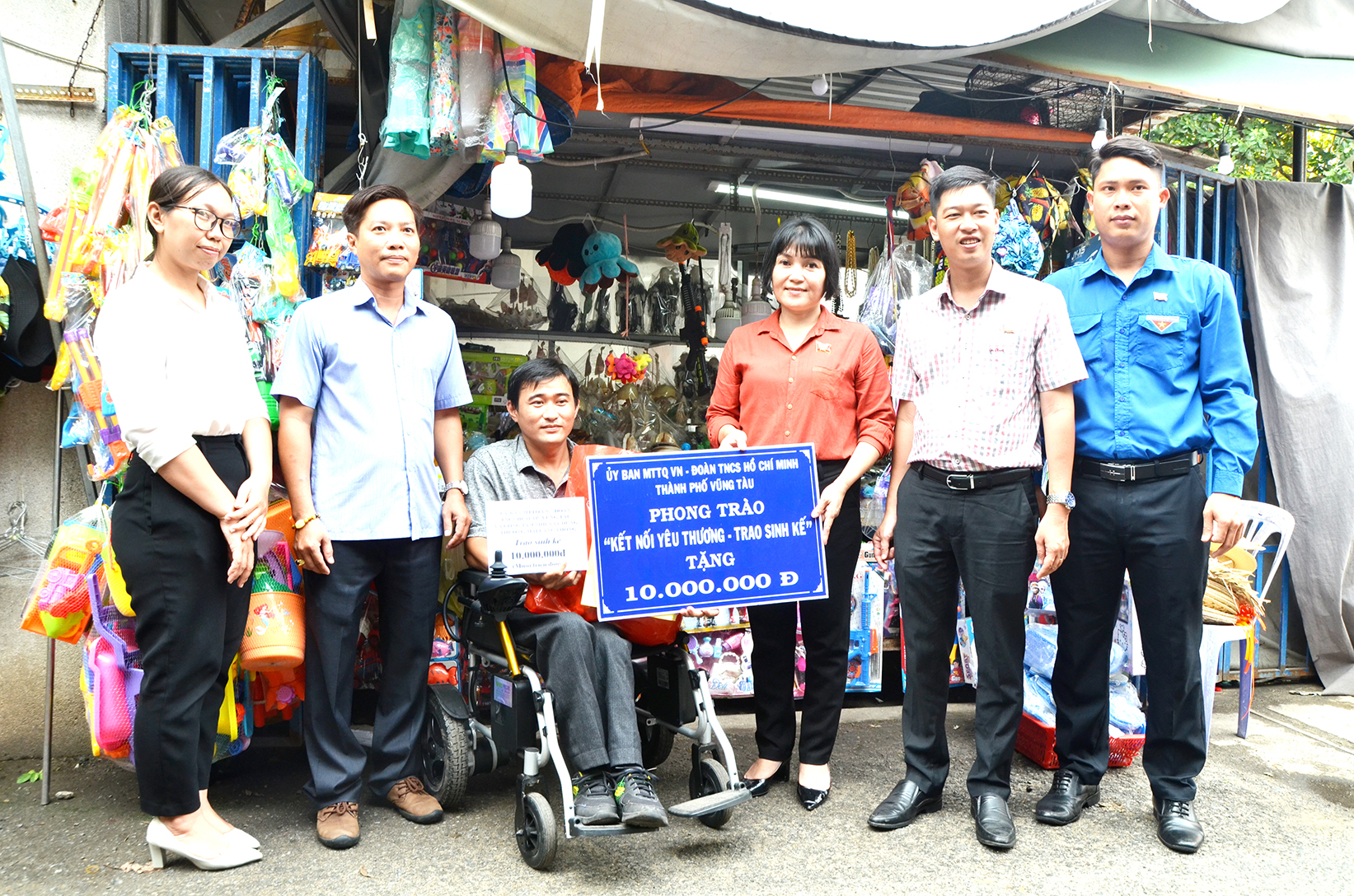 | Bà Mai Ngọc Oanh, Chủ tịch UBMTTQ Việt Nam TP.Vũng Tàu trao tiền hỗ trợ giúp ông Đỗ Trọng Tân (phường 2) phát triển kinh tế. |