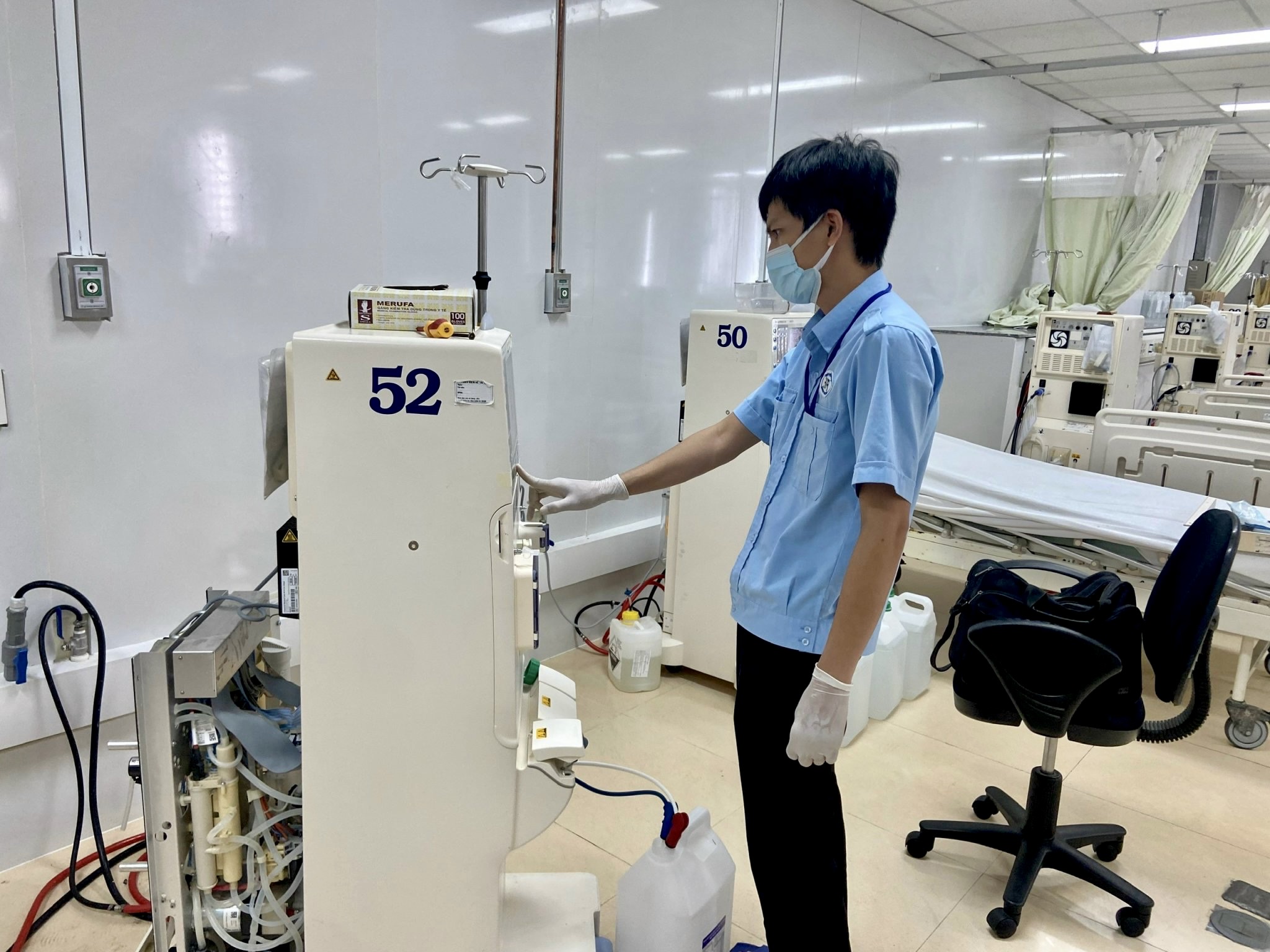 | Nhân viên Phòng trang thiết bị y tế (Bệnh viện Bà Rịa) kiểm tra và sửa chữa các máy lọc máu hư hỏng. |