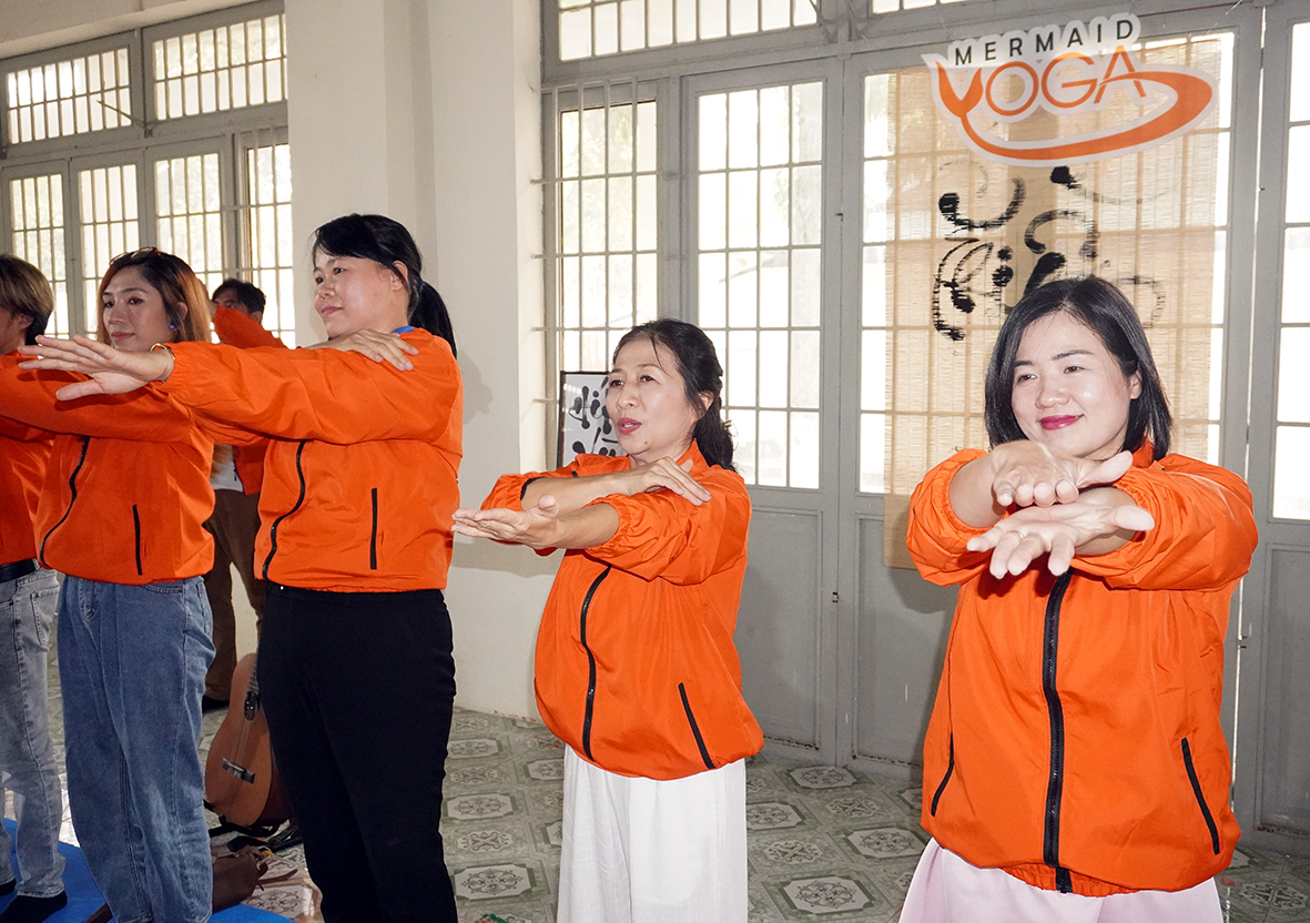 Mở đầu hoạt động là phần “truyền lửa”. Các học viên cùng nhau thực hiện bài tập vỗ tay và các động tác khởi động cơ bản. Hoạt động này khiến giúp học viên làm quen với các huấn luyện viên của Mermaid Yoga.