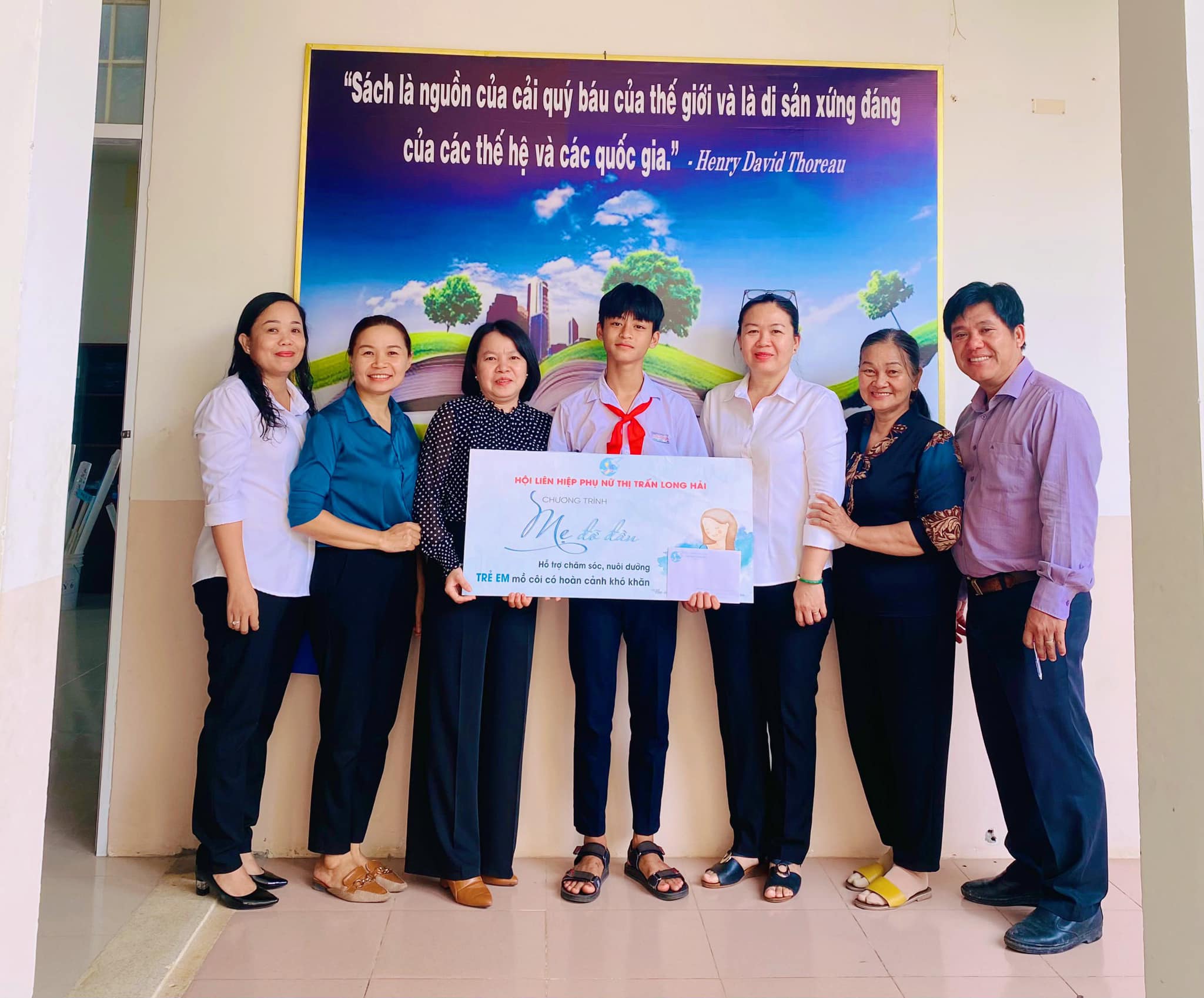 | Hội LHPN thị trấn Long Hải, Ban Giám hiệu và Ban đại diện Hội cha mẹ học sinh Trường THCS Nguyễn Công Trứ trao bảng tượng trưng nhận đỡ đầu em Huỳnh Hoàng Nhất. |
