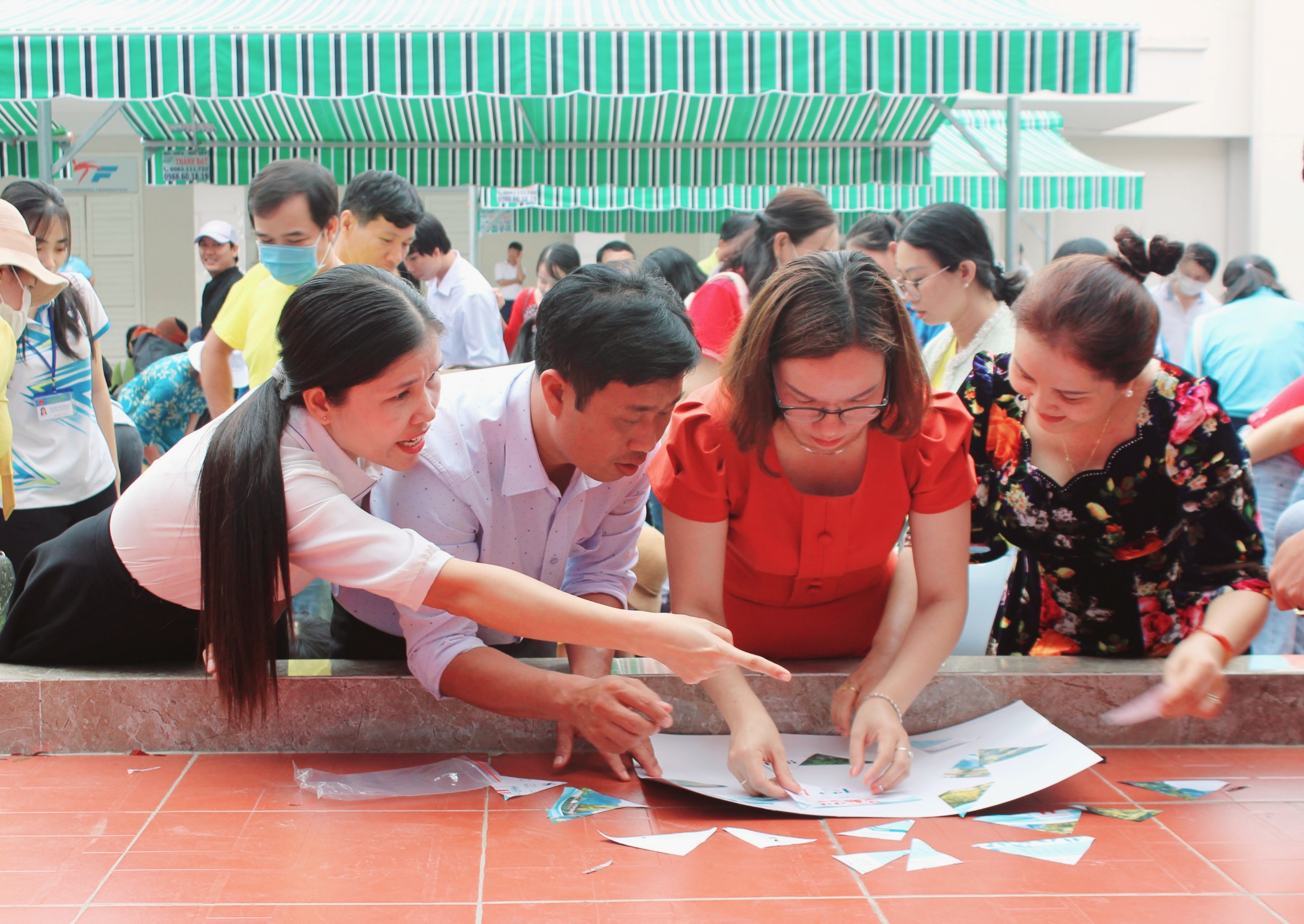 | Các công đoàn viên tham gia trò chơi "Mảnh ghép yêu thương". |