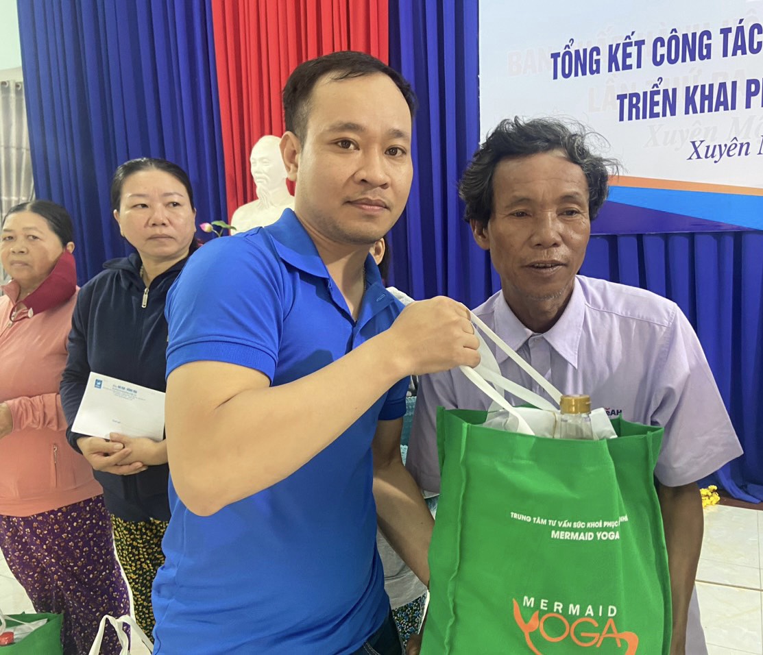 Mỗi phần quà trị giá 1,5 triệu đồng gồm nhu yếu phẩm như nước mắm, nước tương, đường, bánh kẹo, mứt Tết và tiền mặt do Công ty TNHH Lan Anh và Trung tâm Tư vấn sức khỏe phục hồi tự nhiên Mermaid Yoga tài trợ.
