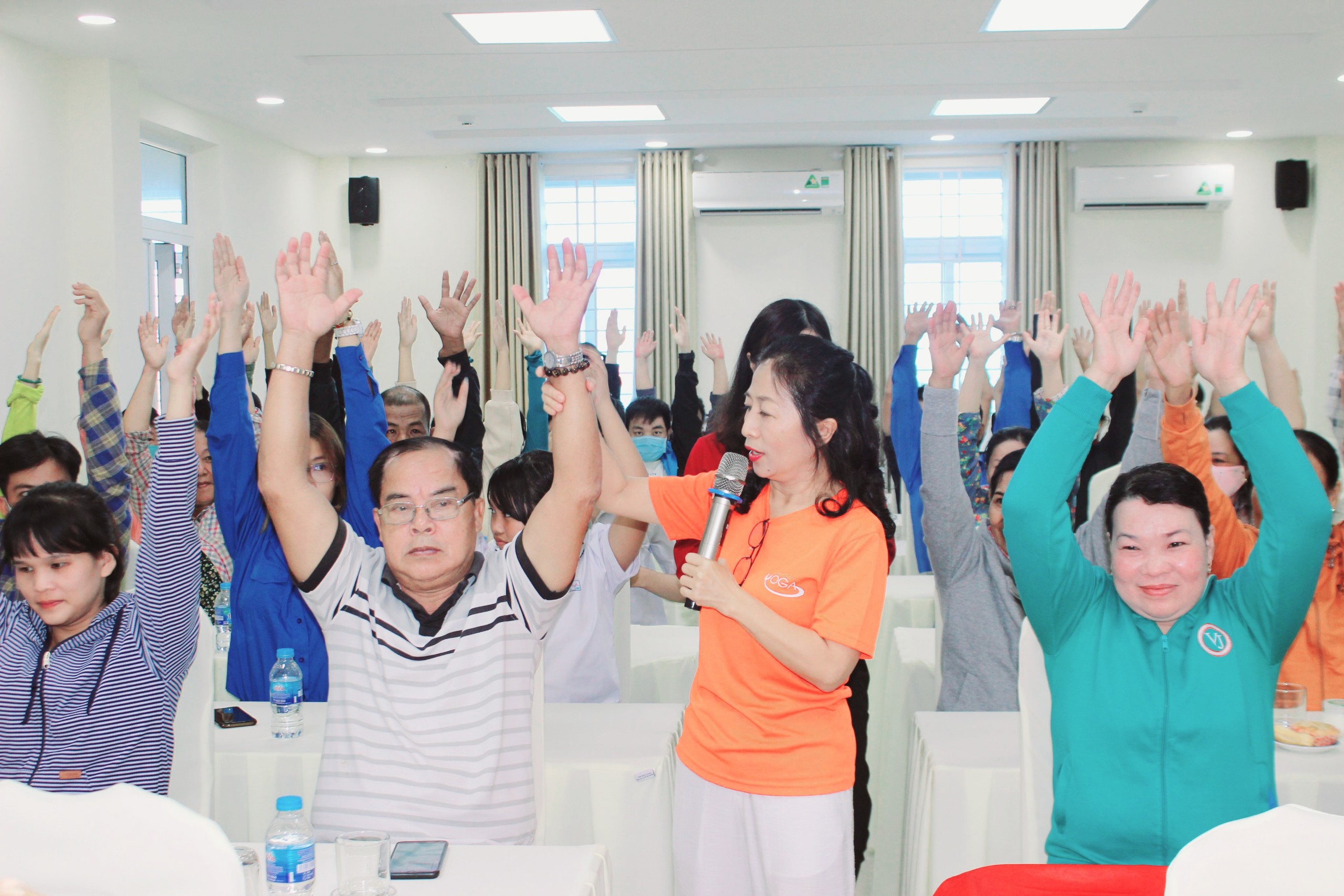 | Bà Phan Mai Hương hướng dẫn những người tham dự thiền trà các động tác thể dục Thân - Tâm - Trí mỗi ngày. |