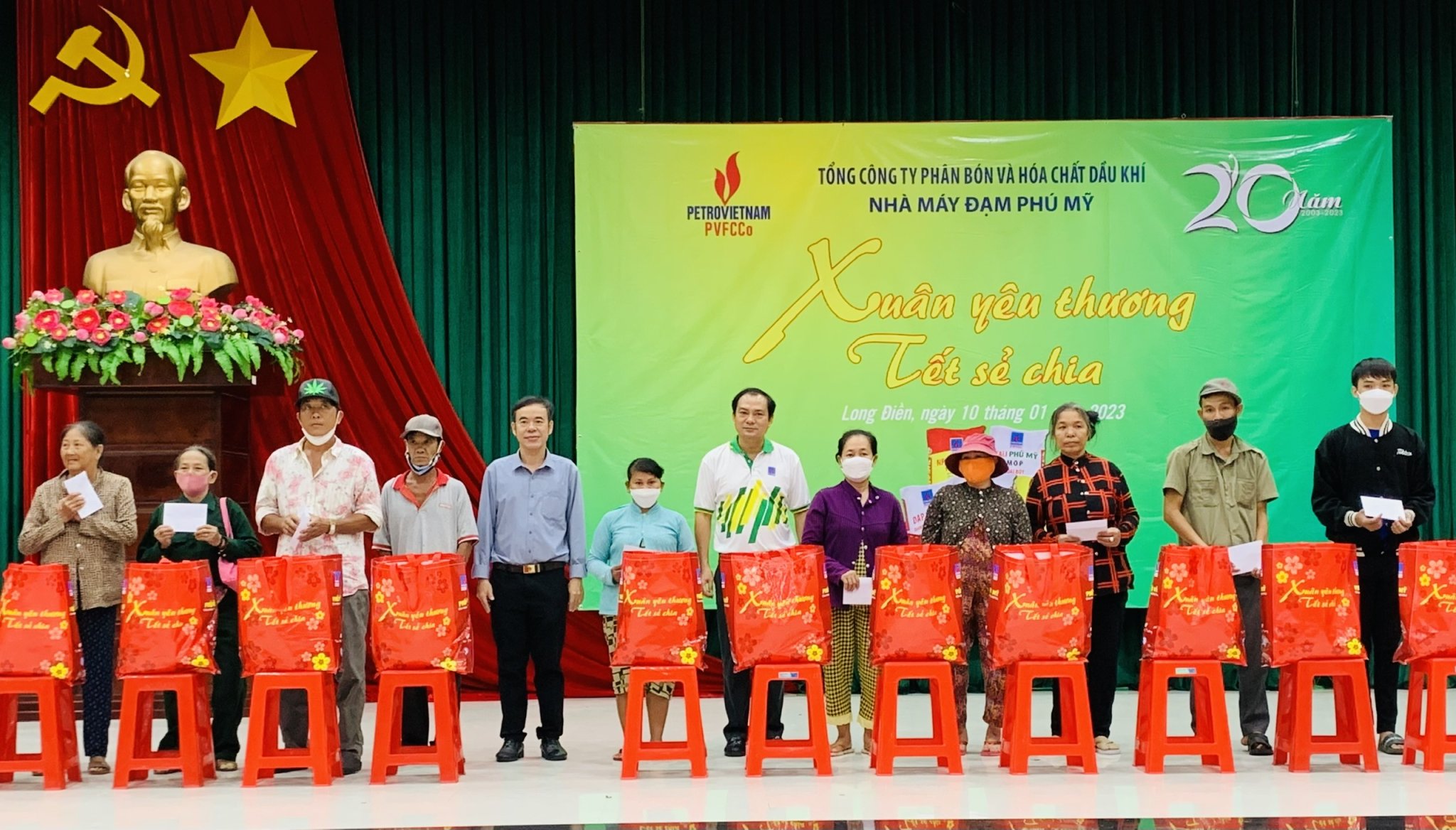 Cụ thể, mỗi hộ nghèo, hộ có hoàn cảnh khó khăn được nhận phần quà Tết trị giá 800 ngàn đồng (trong đó, gồm bánh, mứt, nhu yếu phẩm và 500 ngàn đồng tiền mặt). Kinh phí trao tặng quà do Nhà máy Đạm Phú Mỹ thuộc Tổng Công ty phân bón và hoá chất dầu khí tài trợ.