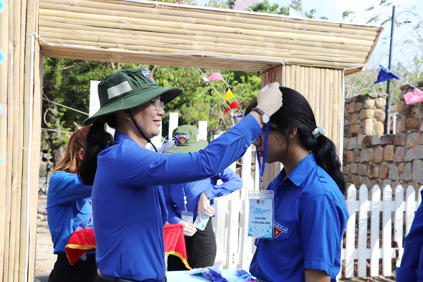 | Chị Hồ Thị Ánh Tuyết, Bí thư Tỉnh Đoàn đeo thẻ cho các trại sinh trước khi nhập trại. |
