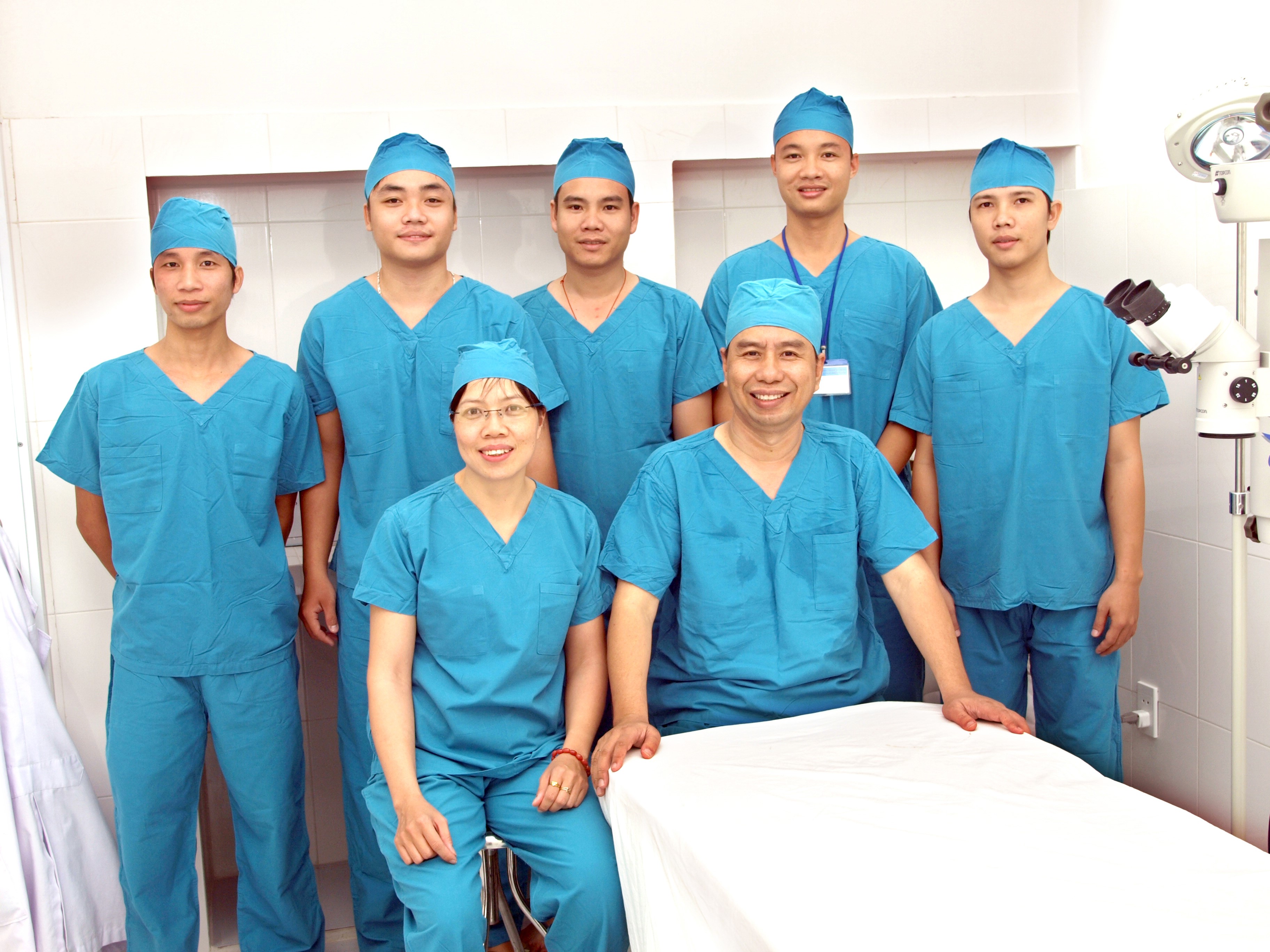 | Bác sĩ Nguyễn Viết Giáp (ngồi bên phải) và các đồng nghiệp trước giờ thực hiện một phẫu thuật mắt cho bệnh nhân |