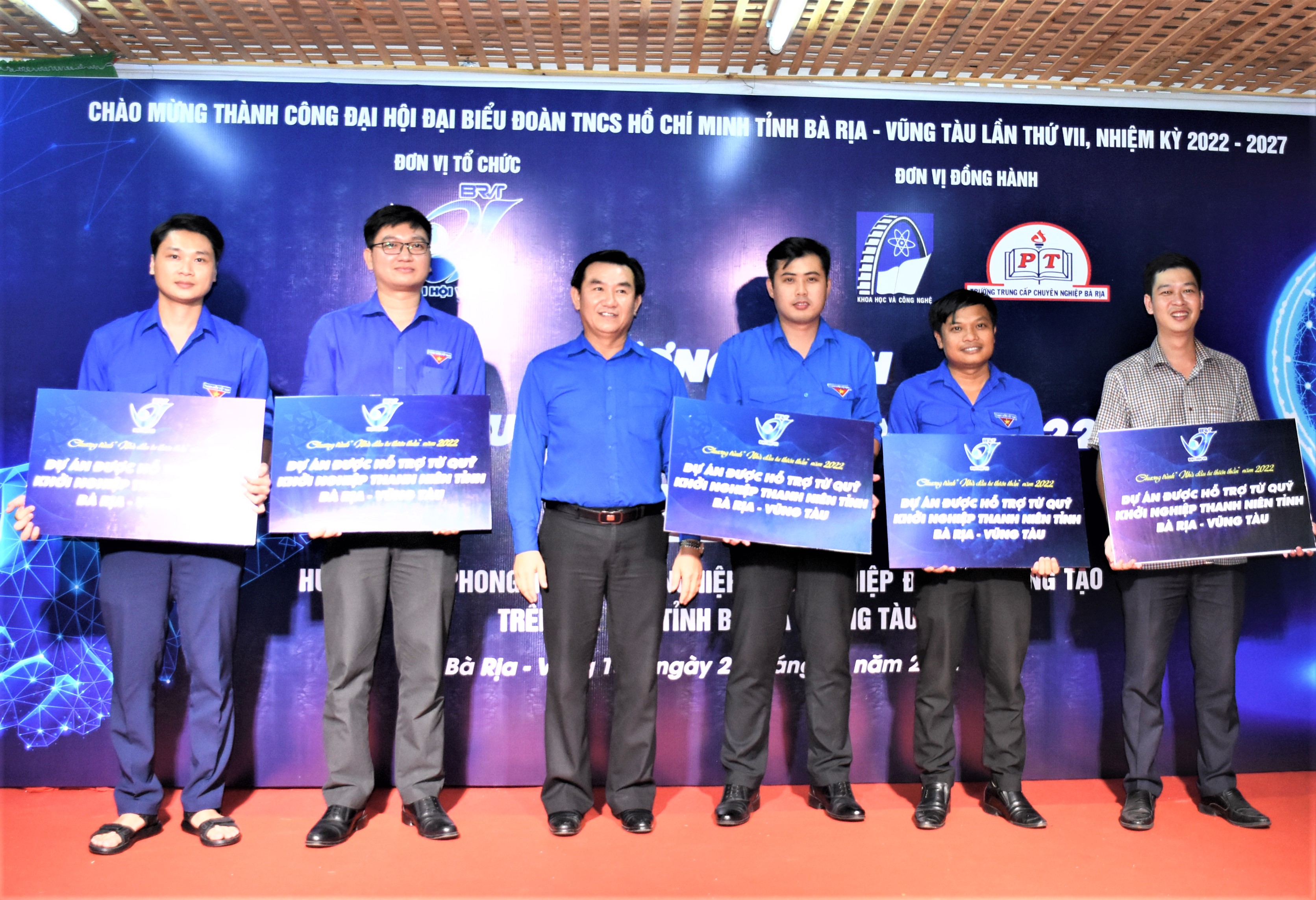 | Tiến sĩ Nguyễn Văn Việt, Hiệu trưởng Trường Trung cấp chuyên nghiệp Bà Rịa, Phó Chủ tịch Hội LNTN Việt Nam tỉnh trao bảng tượng trưng hỗ trợ vốn của “Nhà đầu tư thiên thần” cho đại diện các Huyện, Thị, Thành Đoàn. |