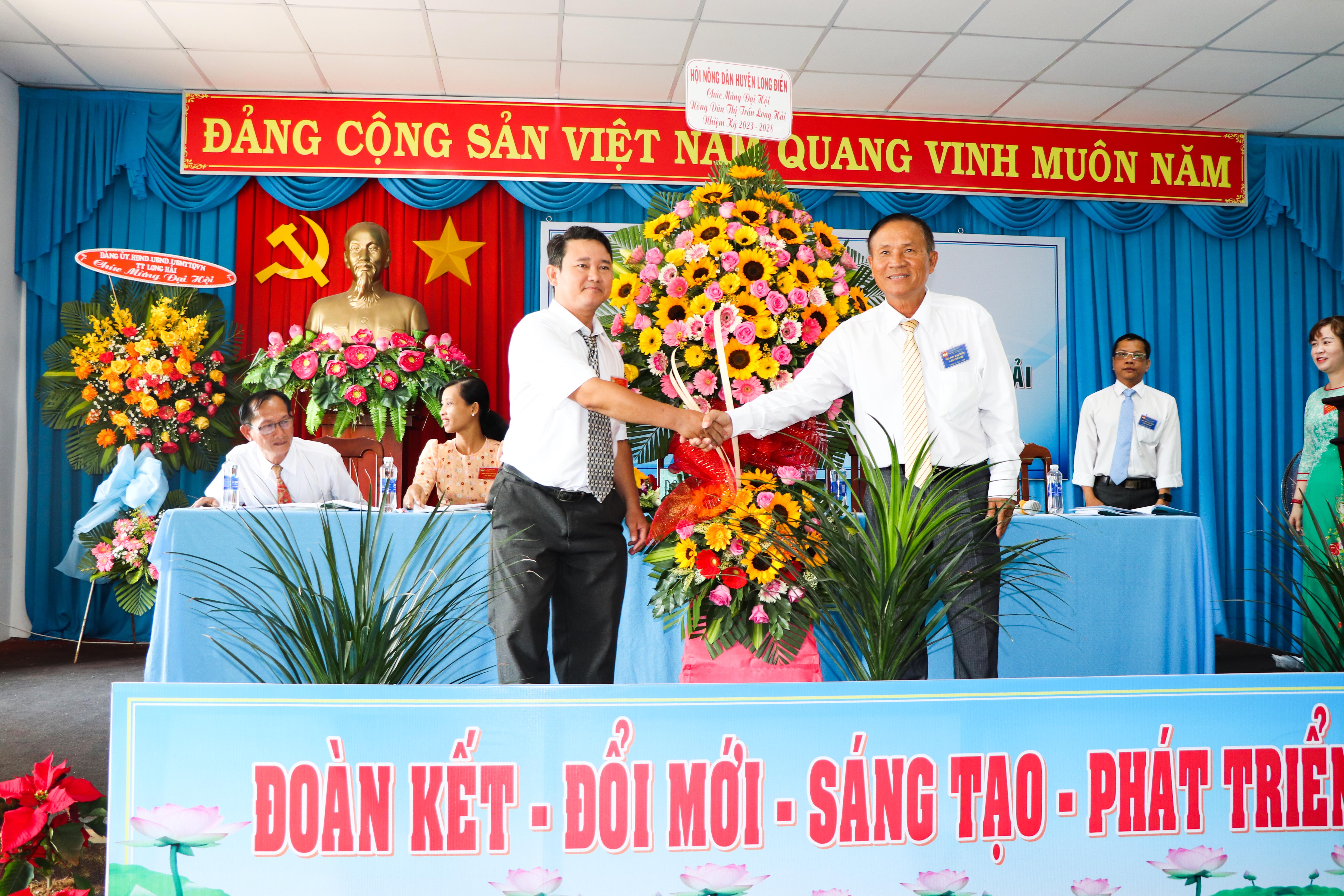 | Ông Ngô Tấn Lập (bên phải), Chủ tịch Hội Nông dân huyện Long Điền tặng hoa chúc mừng Đại hội. |
