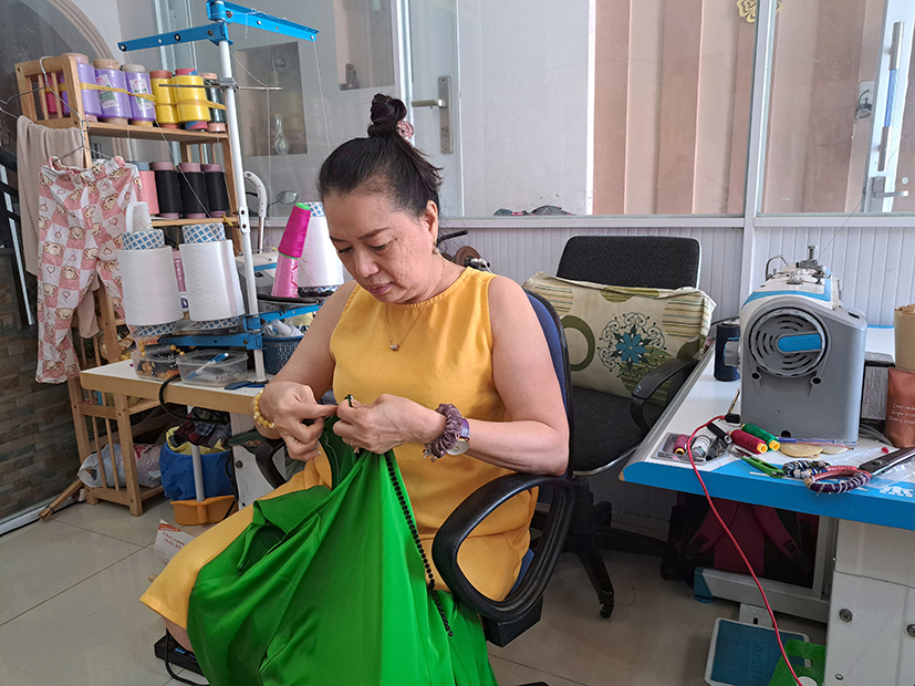 | Chị Vương Hoàng Phi Oanh (phường Phước Hưng, TP. Bà Rịa) gắn đá vào cổ áo dài. |