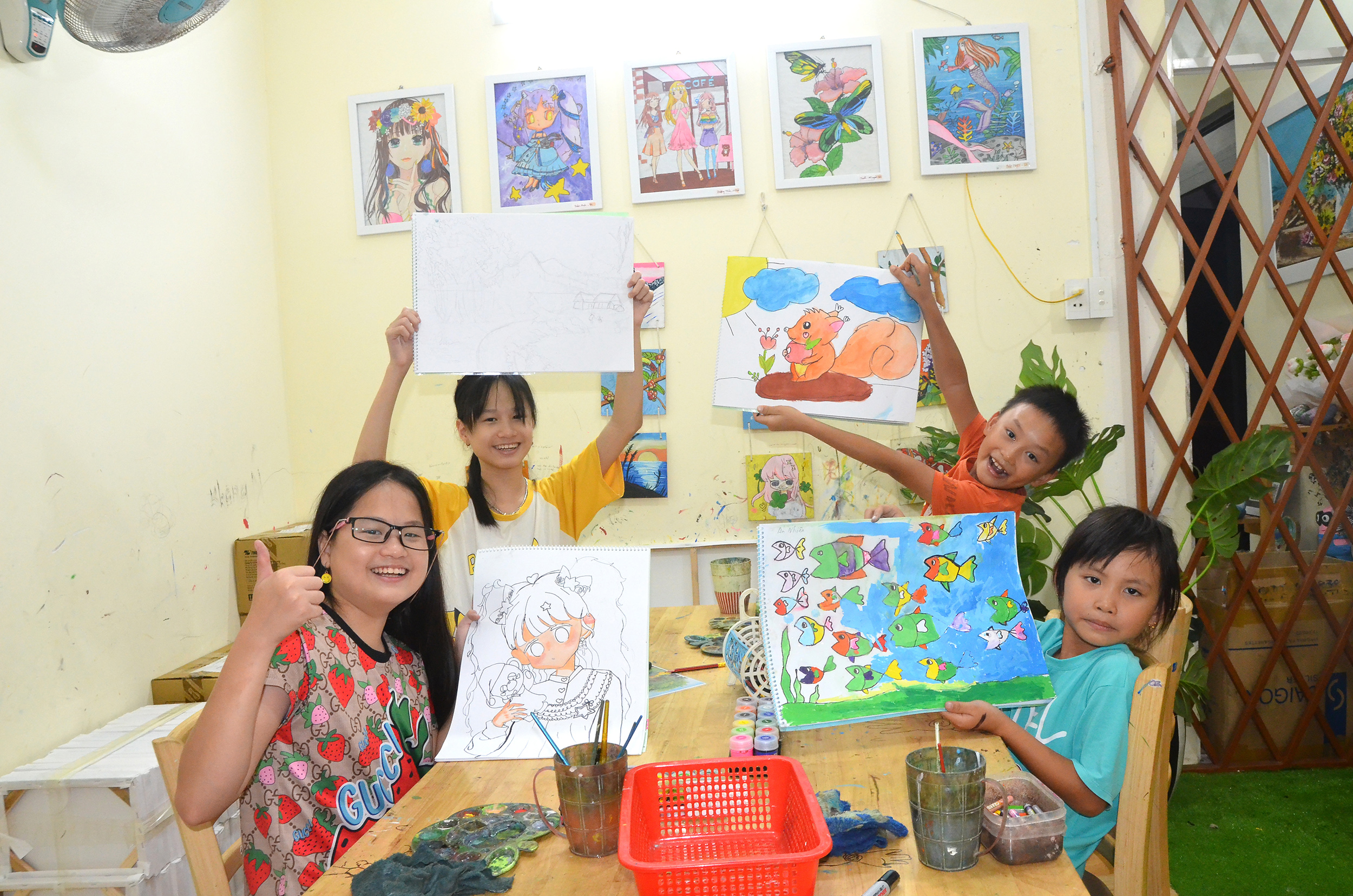 | Lê Trần Ngọc Linh (hàng đầu, trái) cùng em gái và các bạn hào hứng học vẽ ở lớp Tiny Art (Chung cư Seaview 2, phường 10, TP.Vũng Tàu). |